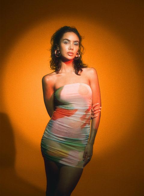 Strapless mini dress Slim fitting 95% polyester 5% elastane Length of size US 4 / AU 8 bust to hem: 57cm / 22.4in Tamika is wearing a size US 2 / AU 6 Danika is wearing a size US 4 / AU 8 Mesh material Printed design Inner silicone strip at bust Ruched sides Good stretch Fully lined