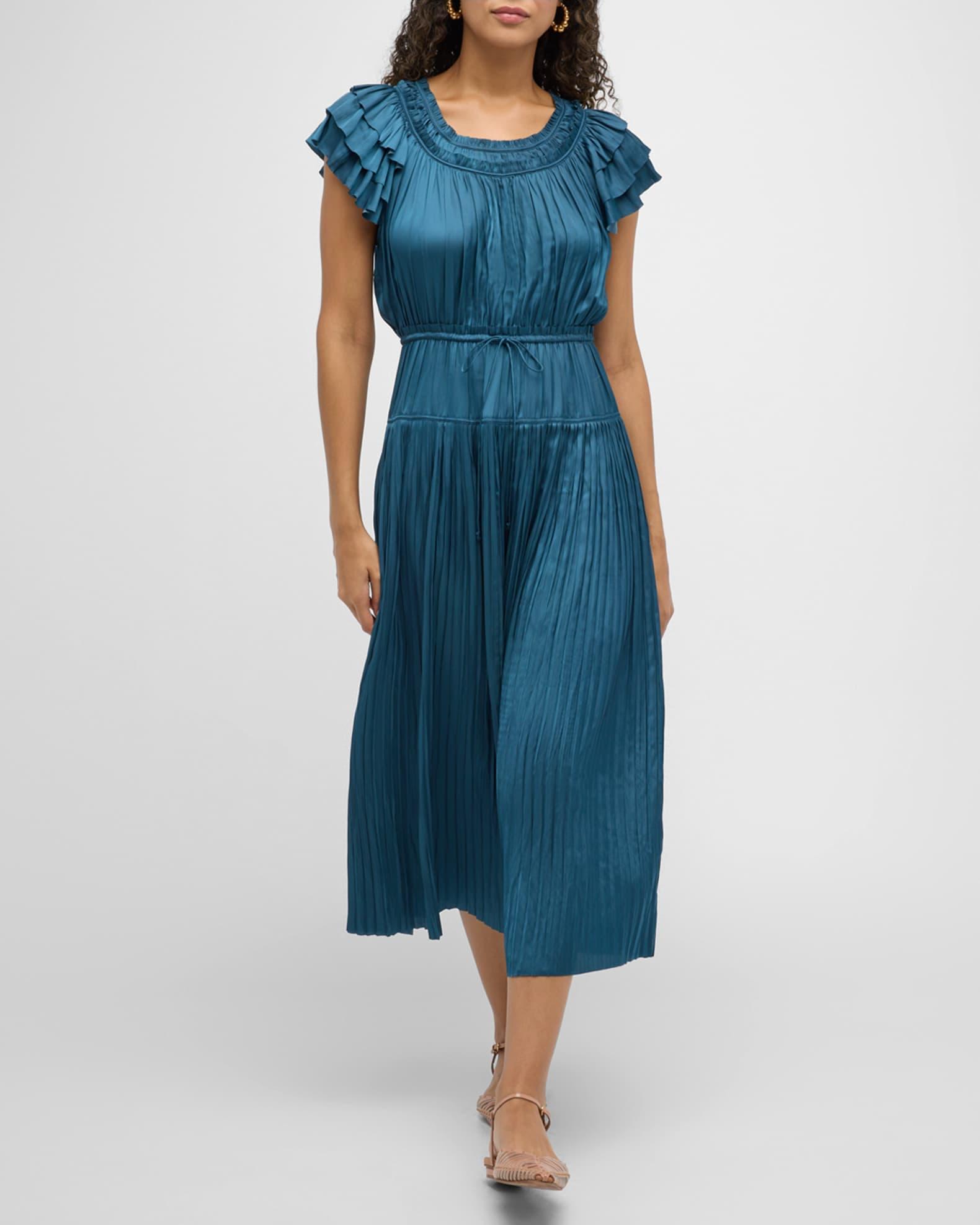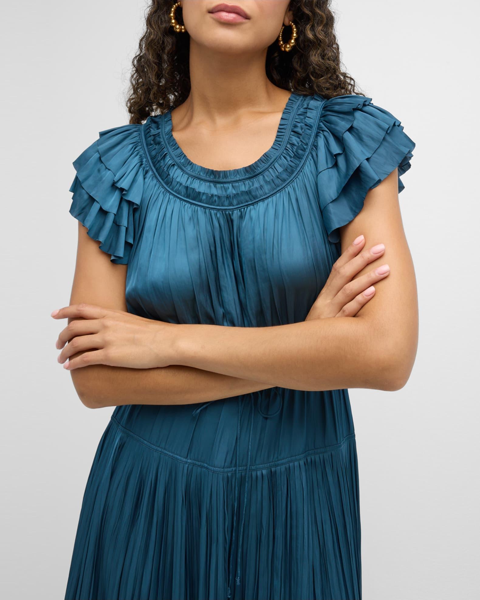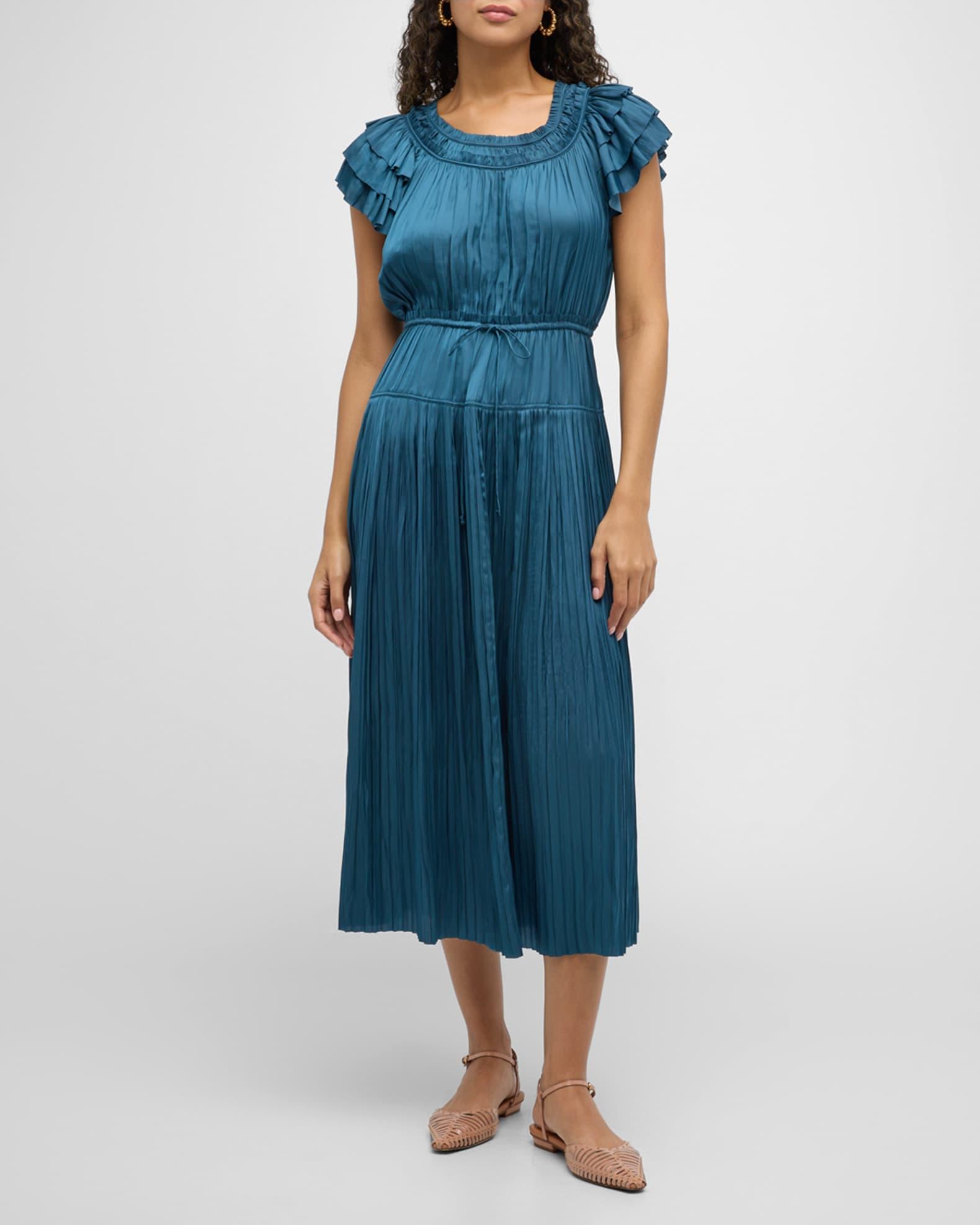 Ulla Johnson "Kalesta" pleated midi dress with ruffles Approx. 49.5"L from shoulders to hem Scoop neckline Short sleeves Drawstring waist self-tie Hem falls below the knee A-line silhouette Slipover style Polyester Dry clean Imported Model is 5'10"/177cm.