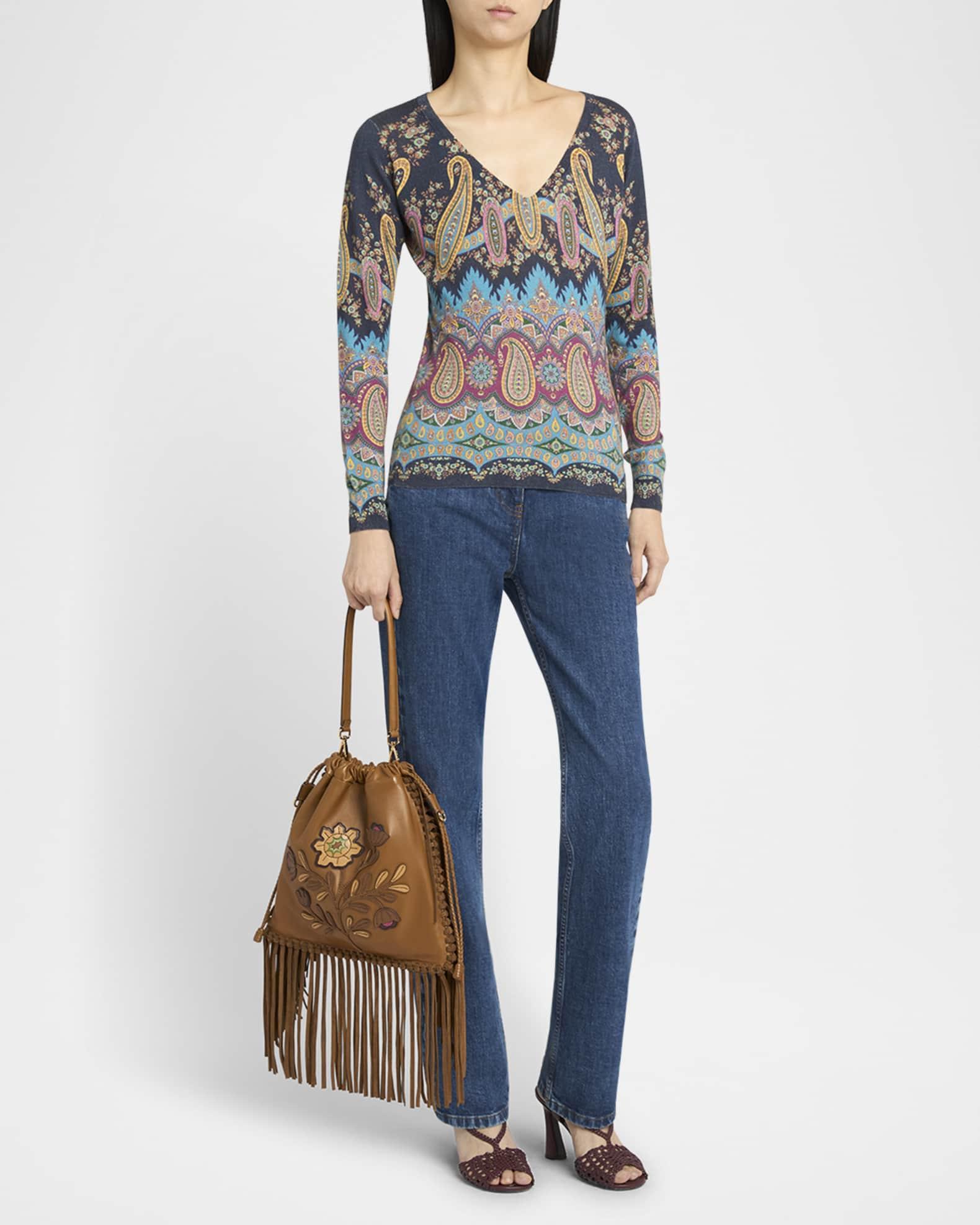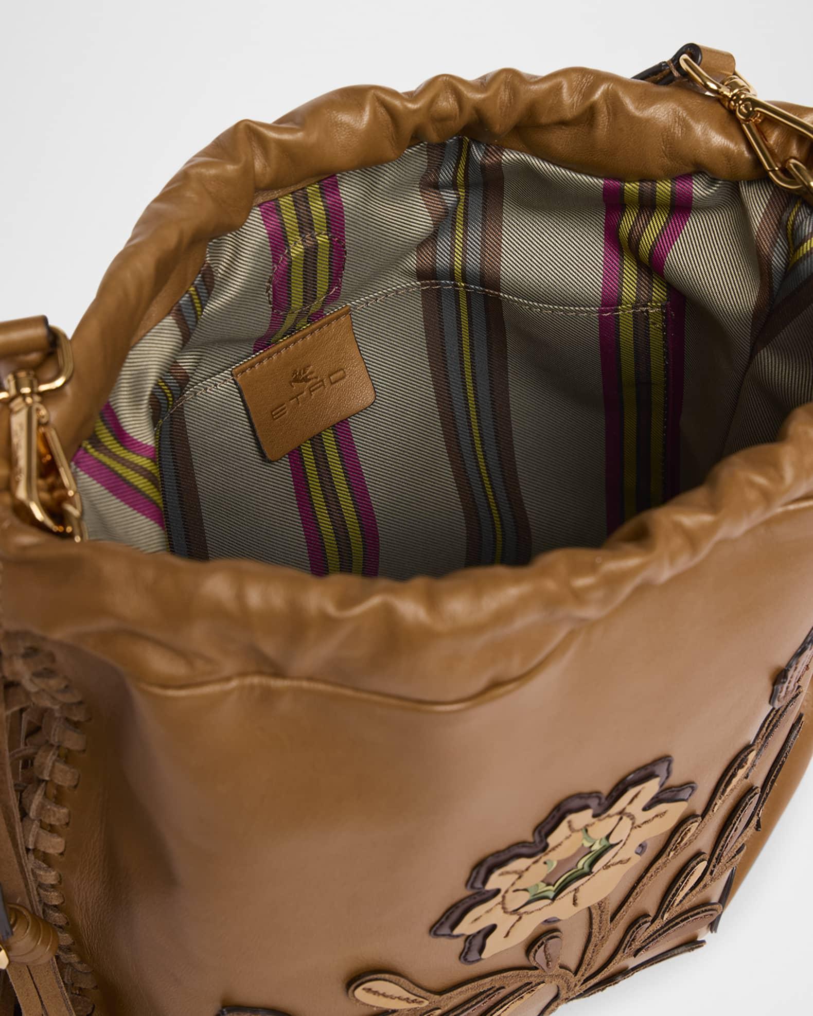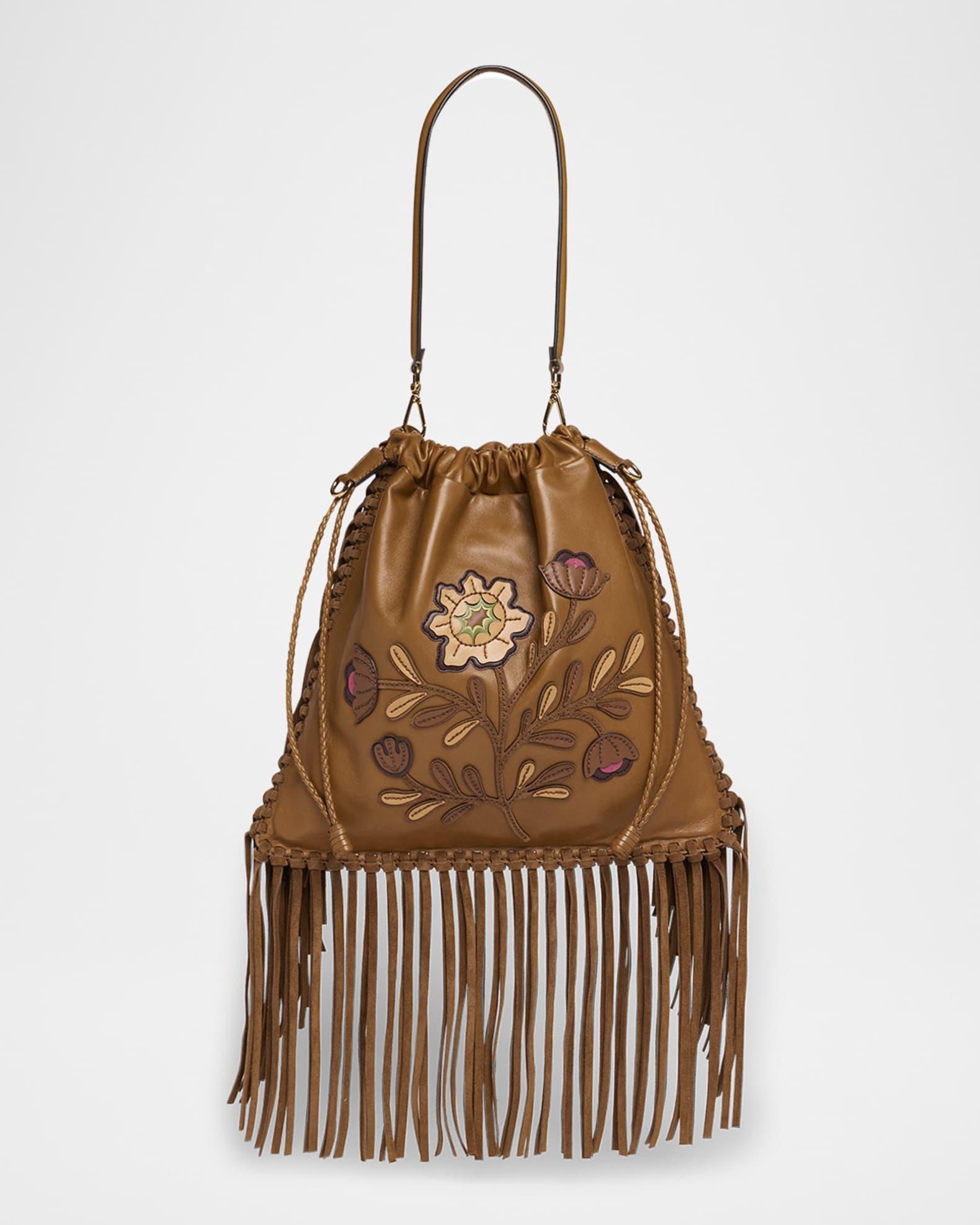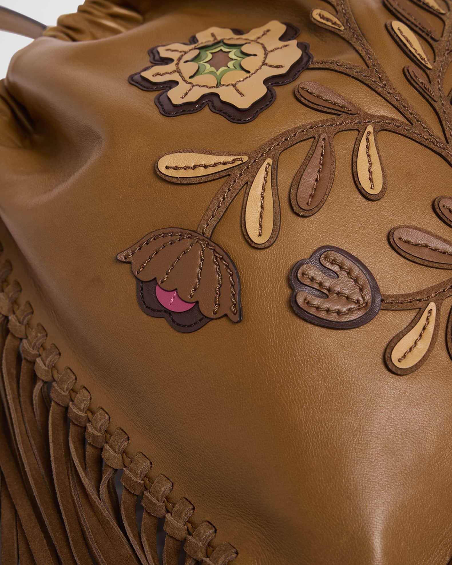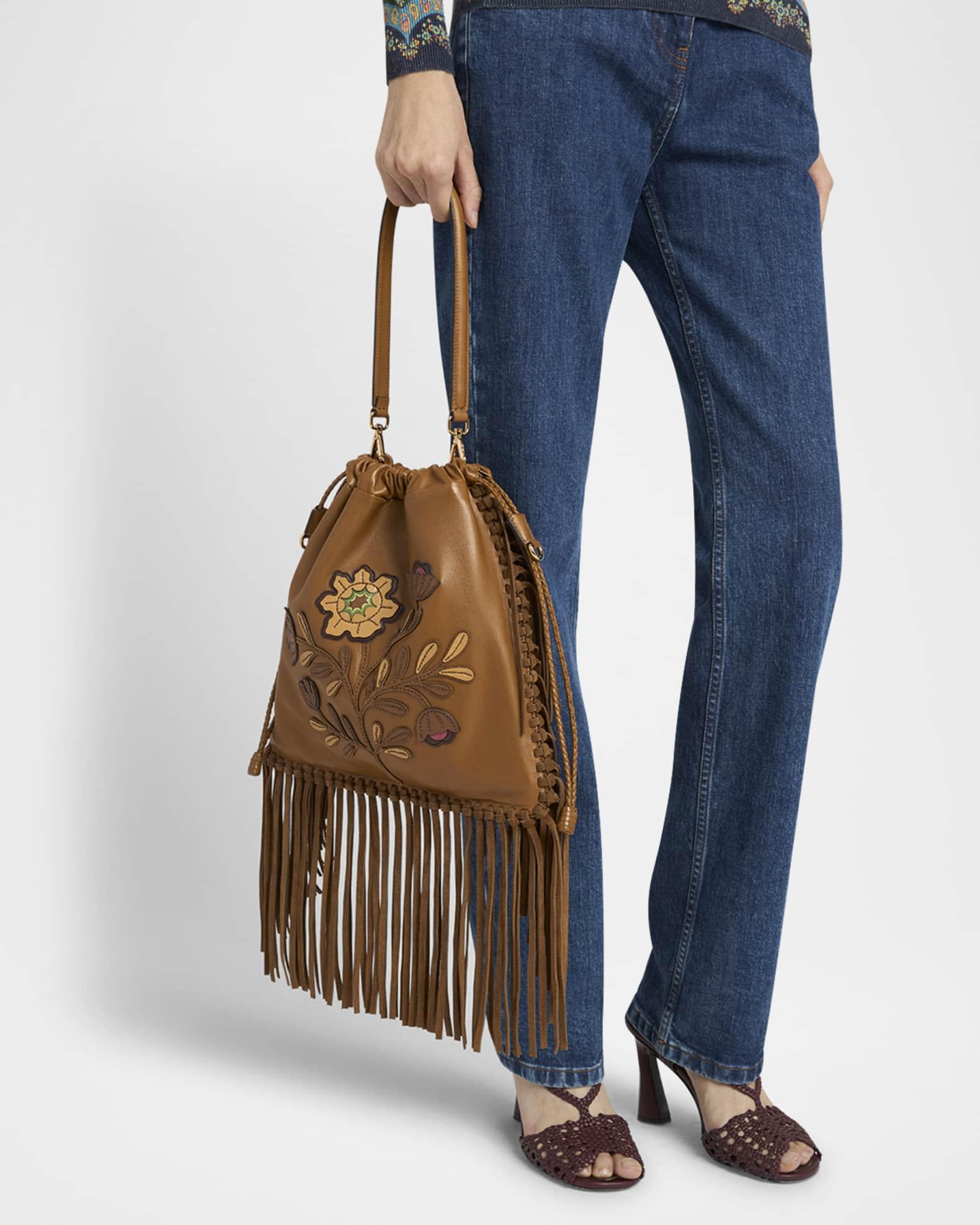 Made of smooth leather, this Etro "Kalispera" shoulder bag is fringed with strips of suede and features a large, bold floral appliqué Detachable shoulder strap Drawstring closure Interior, one slip pocket Lining: Polyester Approx. 12.2"H x 12.2"W x 1"D Made in Italy