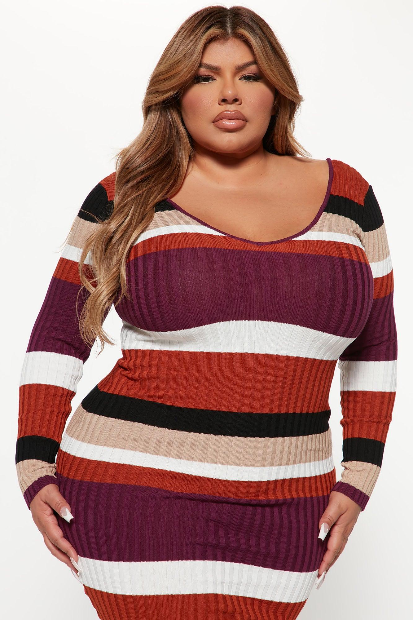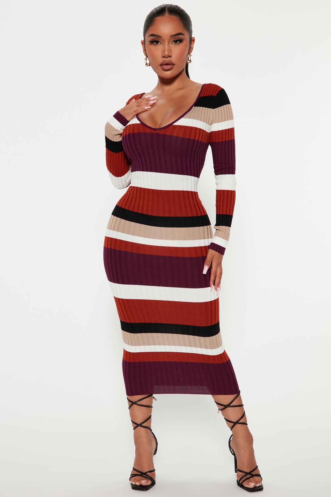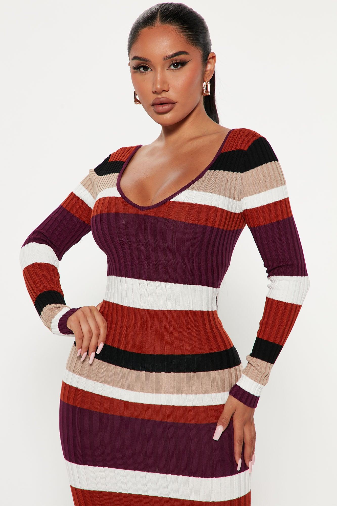 Available In Black/combo, Red/combo, And Purple/combo. Striped Sweater Midi Dress Long Sleeve Double V Neckline Stretch 80% Viscose 20% Nylon Imported
