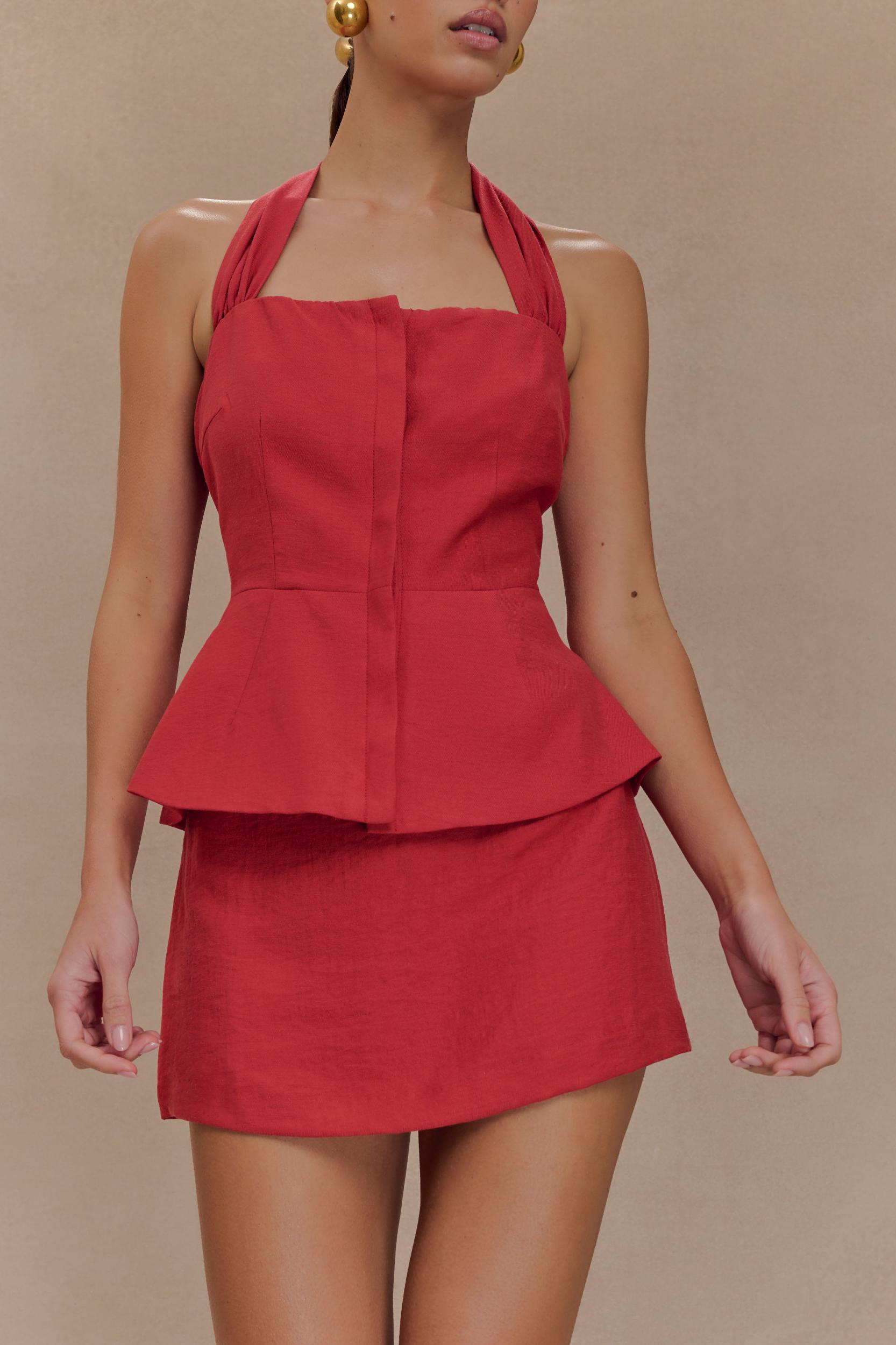 Tailored lines, tied in linen. The KALLIE Linen Peplum Halter Top blends feminine structure with warm-weather ease. Featuring a tie-back halter neckline and subtle diamond darts at the front, this fully lined silhouette is detailed with a concealed centre front placket and a defined waist seam that flows into a soft peplum hem. Lightweight yet elevated, this top is perfect for styling with crisp shorts or wide-leg pants for a polished look that transitions from sun-soaked afternoons to breezy evenings.