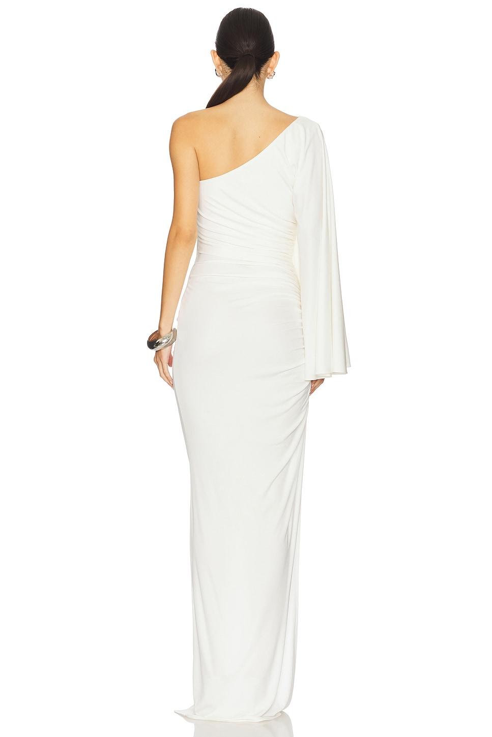 96% viscose, 4% spandex. Dry clean only. Partially lined at bust. Hidden side zip closure. One shoulder styling. Ruched sides and side slit. Heavyweight jersey fabric. Made in China. Revolve Style No. RONR-WD786. Manufacturer Style No. 4284374JER.