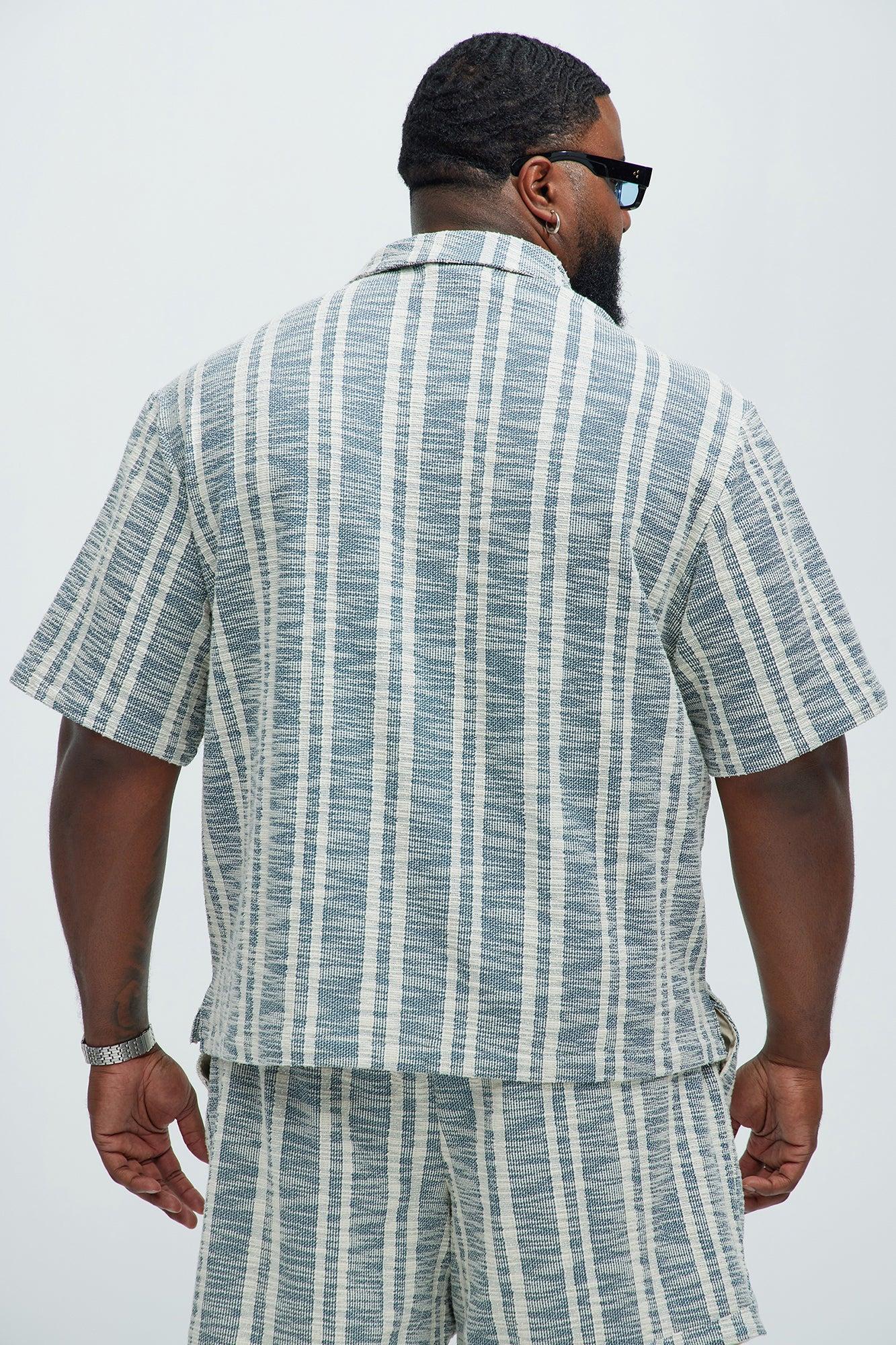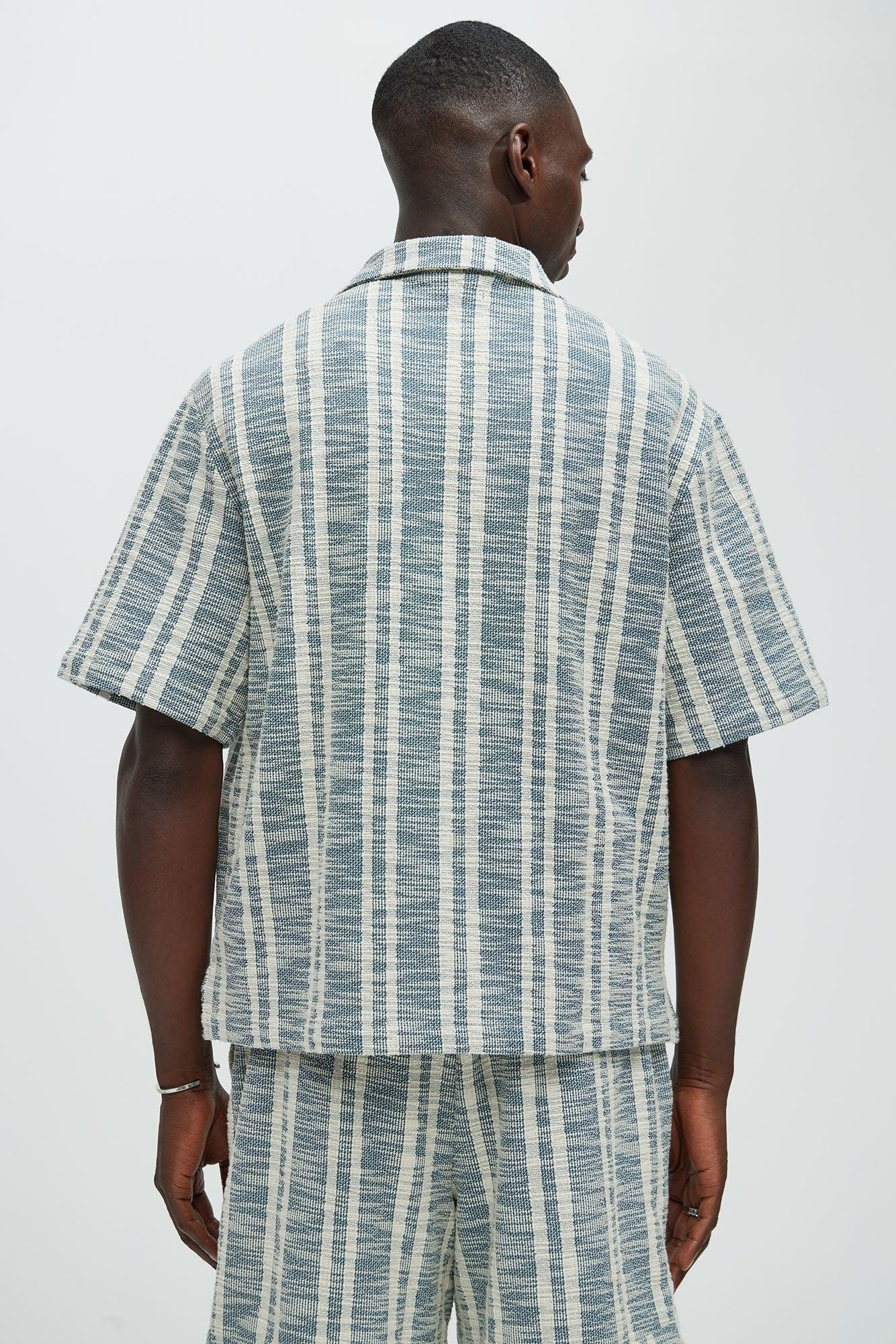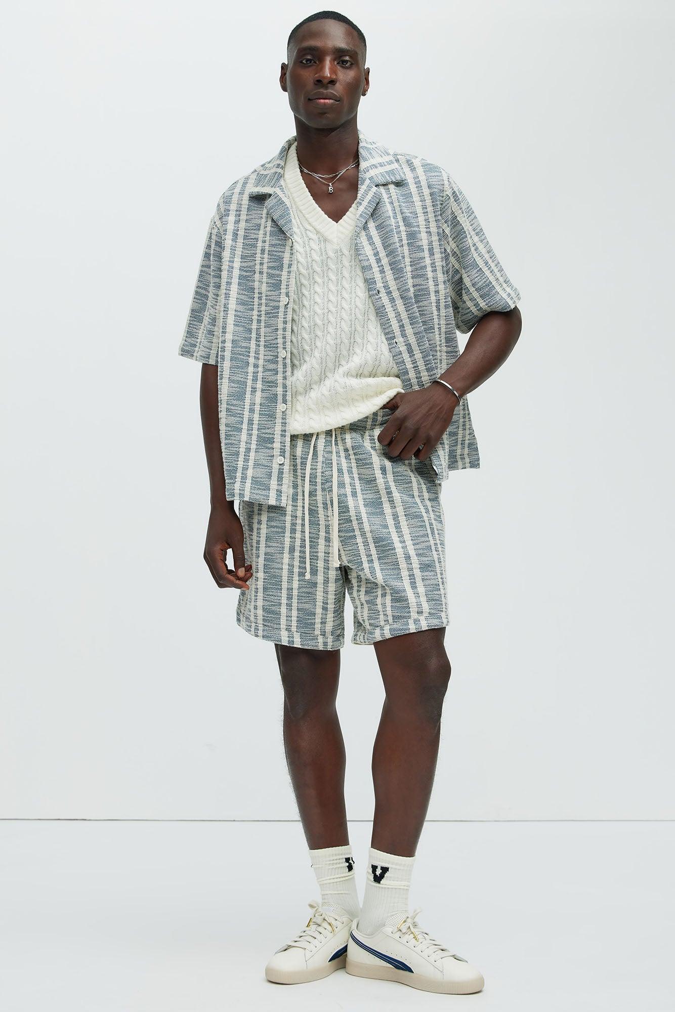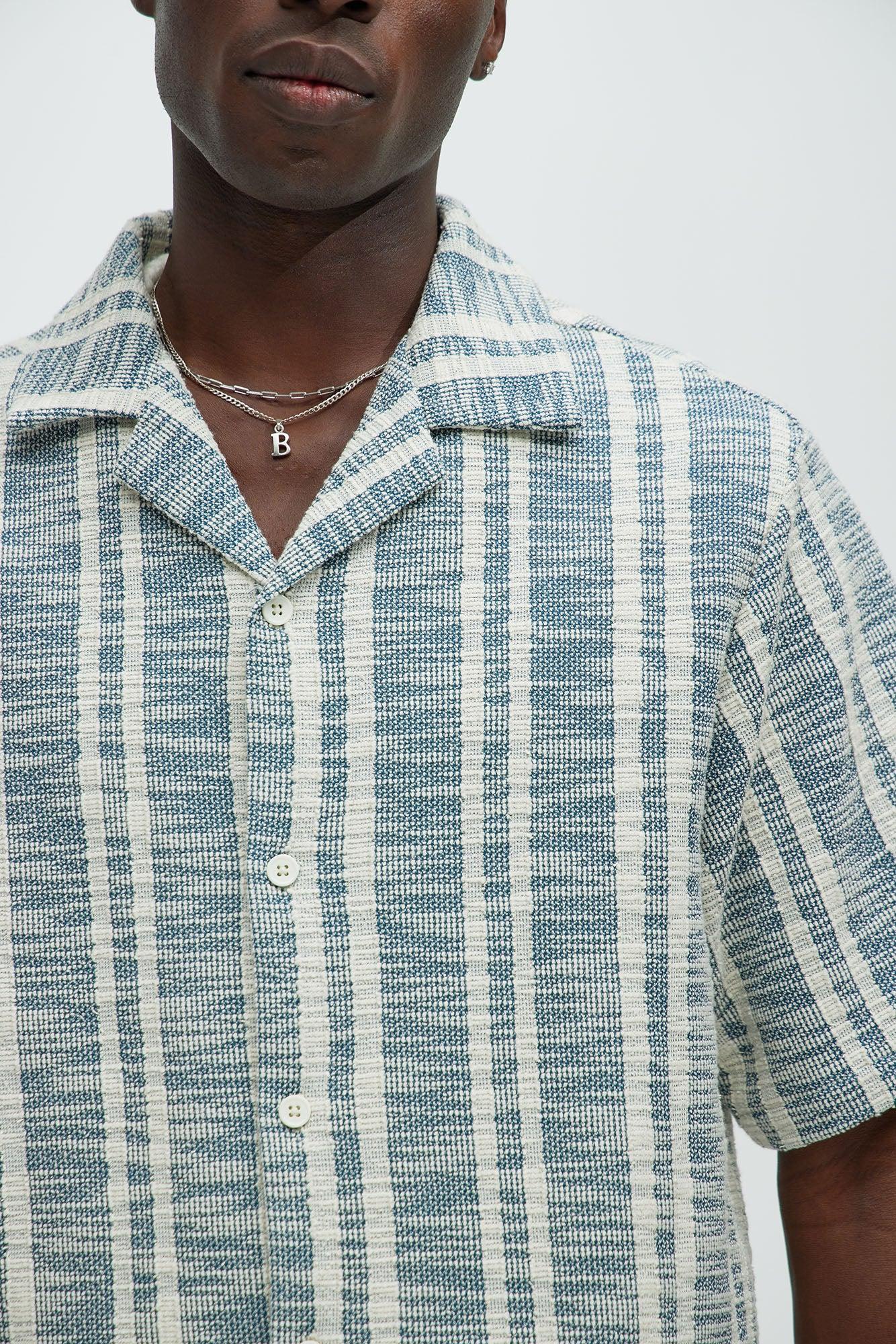 Available In Blue/combo and Tan/Multi Fold Down Collar Front Button Closure Short Sleeve 60% Cotton, 39% Polyester, 1% Spandex Pair With "Kam Textured Shorts" Imported California Proposition 65 WARNING: Cancer and Reproductive Harm - www.P65Warnings.ca.gov.