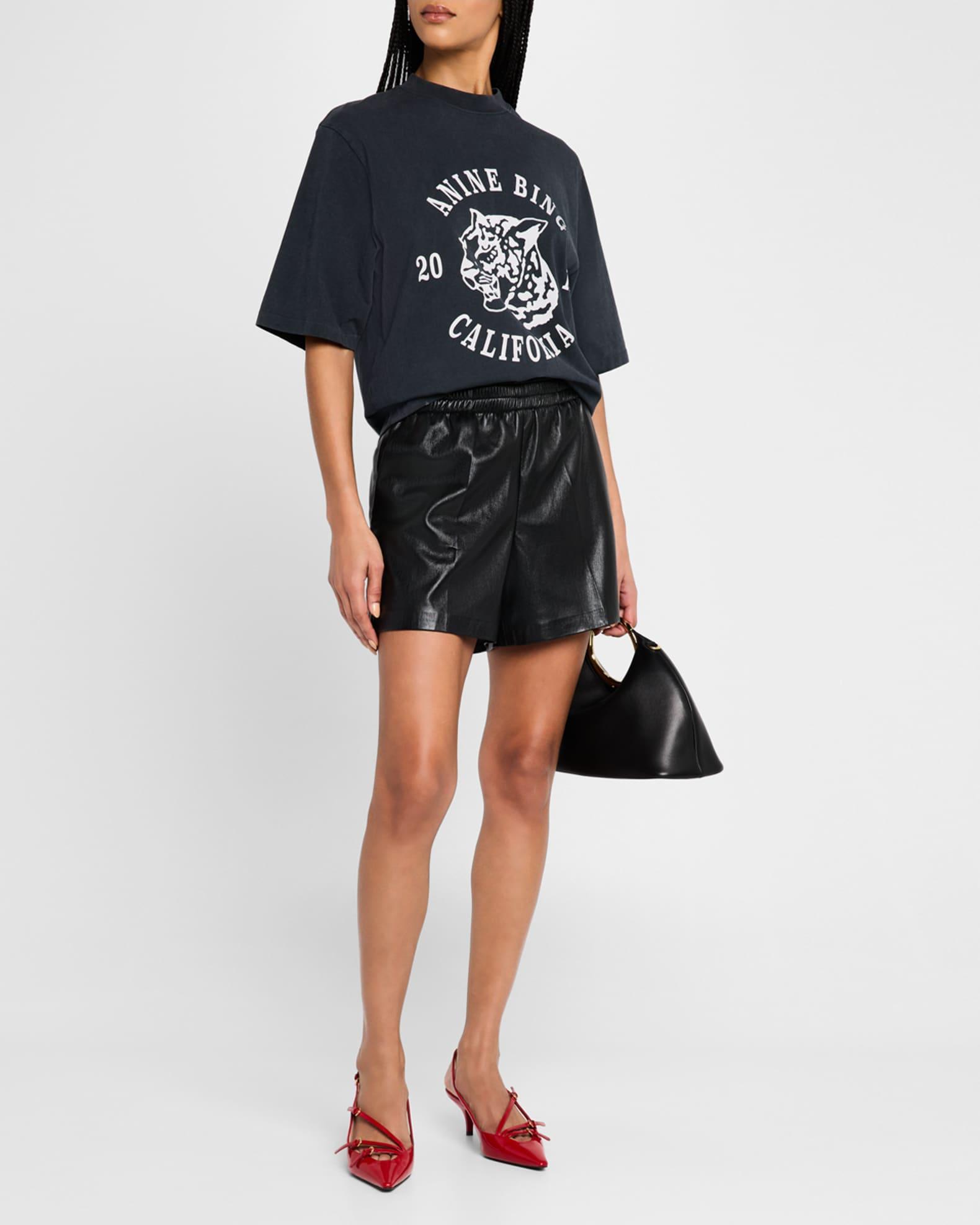 ANINE BING "Kam" shorts made from smooth, high-quality vegan leather with a subtle sheen High-rise concealed drawstring waistband Front slanted pockets Back welt pockets Relaxed legs Pull-on style Polyester/polyurethane Dry clean Imported