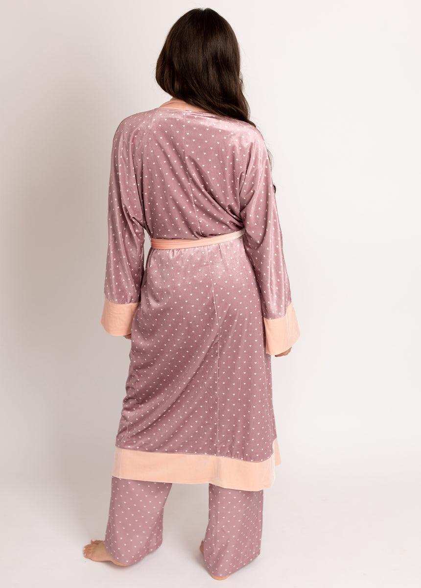 Indulge in ultimate comfort and style with our luxurious Kamila Robe, designed to elevate your lounging experience. Crafted from plush velvet, this robe promises a soft, sumptuous feel against your skin, making it ideal for those cozy nights in. Whether you’re enjoying a leisurely morning or winding down after a long day, this robe ensures you look effortlessly put together while feeling relaxed. Pair it with our Lyana PJs for a complete, matching set that exudes sophistication and charm. Elevate your loungewear collection with this must-have robe and experience the perfect blend of elegance and comfort. Oversized Long length Velvet trim contrast Detachable velvet belt Belt loops at side seams 100% Polyester Hand wash only, line dry Model is 5'5 wearing an XS