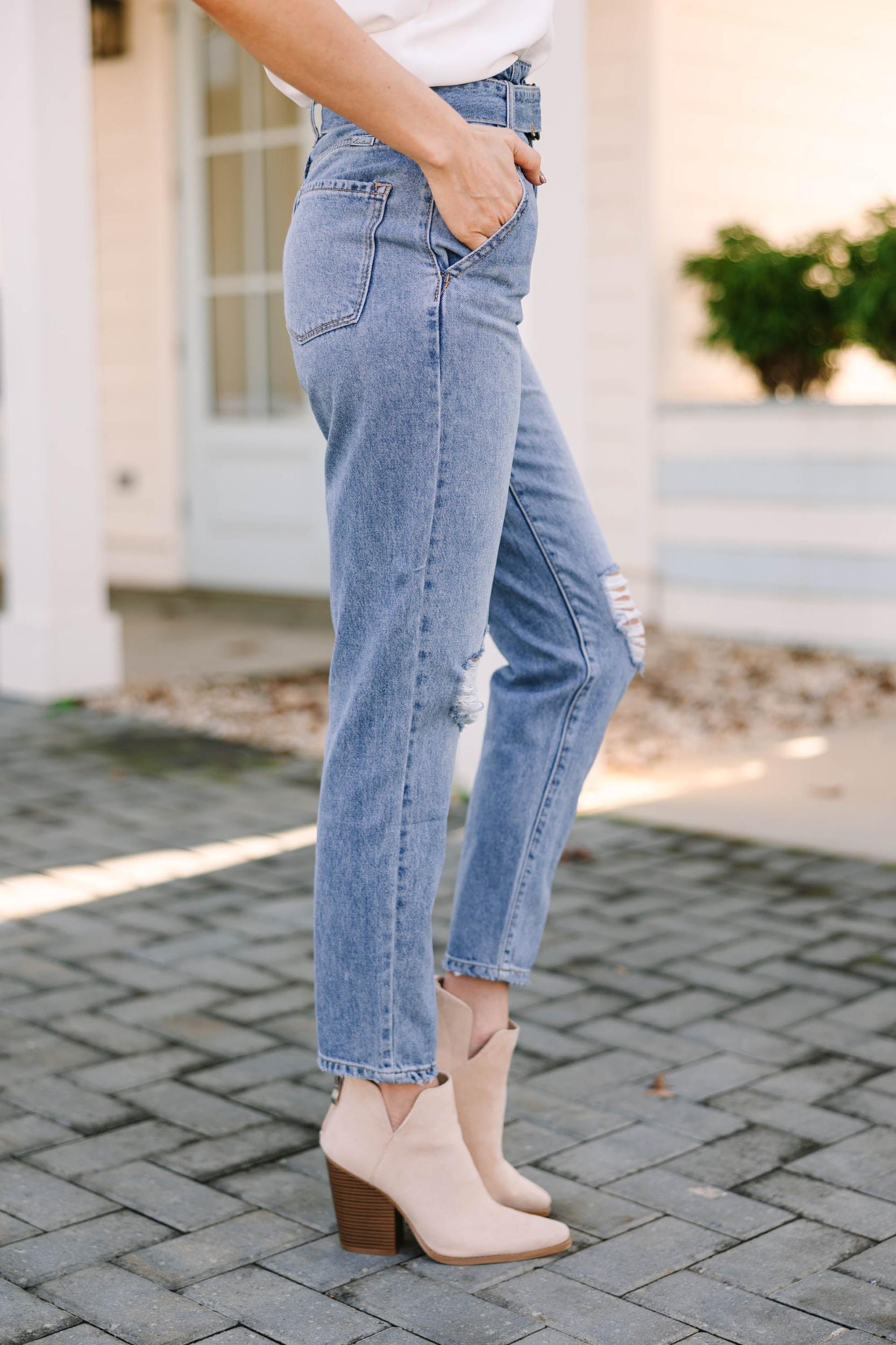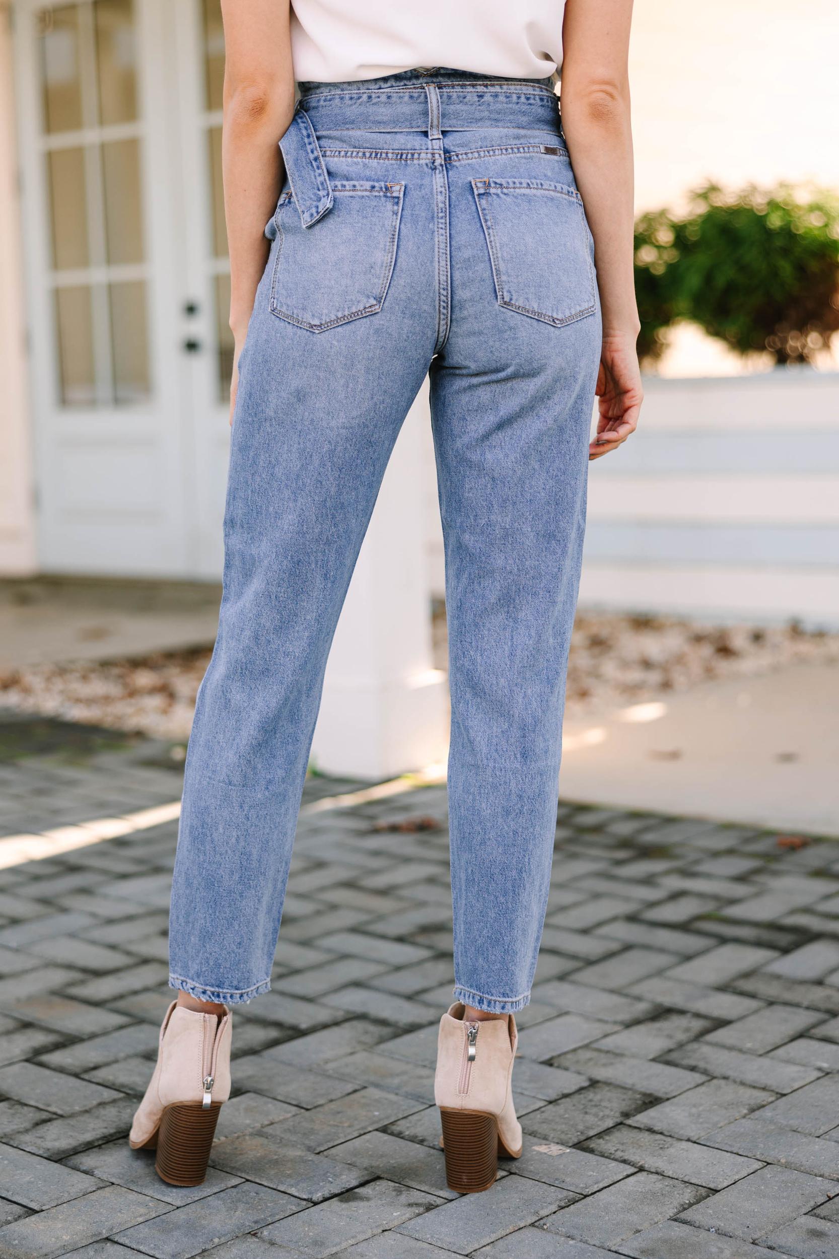 These jeans are so cute and trendy! That high waist is so flattering and we love the light distressing. But our favorite part is that waistline! The belted detail and the split v in the front and back is so unique. These jeans features a high waist, distressing, pockets, a button/zip front closure, and split v front and back detail. Material has a minimal amount of stretch.Cam is wearing the small.