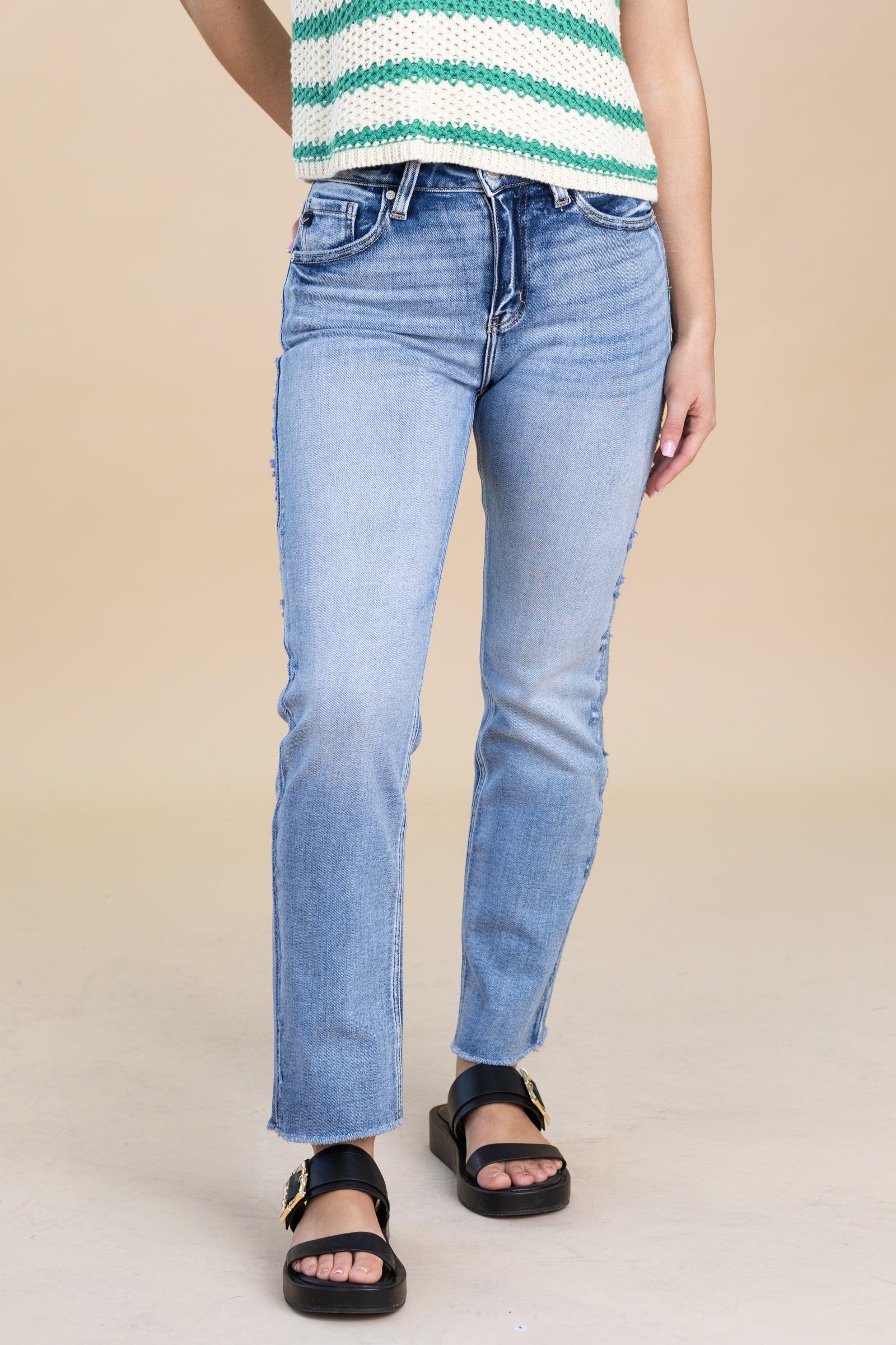 Product Details Color/Wash: Medium Wash Rise: High Rise Style: Straight Leg Brand: KanCan Material and Care 93% Cotton 5% Polyester 2% Spandex Machine Wash Cold Tumble Dry Low Size and Fit 1/24 Rise 10.5" Inseam 28.5" 3/25 Rise 10.5" Inseam 28.5" 5/26 Rise 11" Inseam 29" 7/27 Rise 11" Inseam 29" 9/28 Rise 11.5" Inseam 29" 11/29 Rise 11.5" Inseam 29" 13/30 Rise 12" Inseam 29" 15/31 Rise 12.5" Inseam 29" Photo model is 5'7 and is wearing a size 2/14 Video model is 5’8 and wearing size 1/25