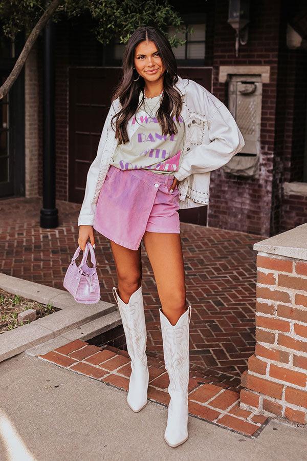- Stay ahead of the trends in this darling skort! - Unlined, pink corduroy material with a fun purple tie dye print - An asymmetrical waistline with belt loops and button/ hidden zip closure - Functional front and back pockets - A wrap style front - A flirty shorts silhouette that ends in straight upper-thigh length hemlines Measurements S : Front Rise 12.5", Hip 34", Inseam 2.5", Length 12.5", Waist 28". M : Front Rise 13", Hip 36", Inseam 2.5", Length 12.5", Waist 30". L : Front Rise 13.5", Hip 38", Inseam 3", Length 13.5", Waist 32". XL : Front Rise 13.5", Hip 40", Inseam 3", Length 14", Waist 34".
