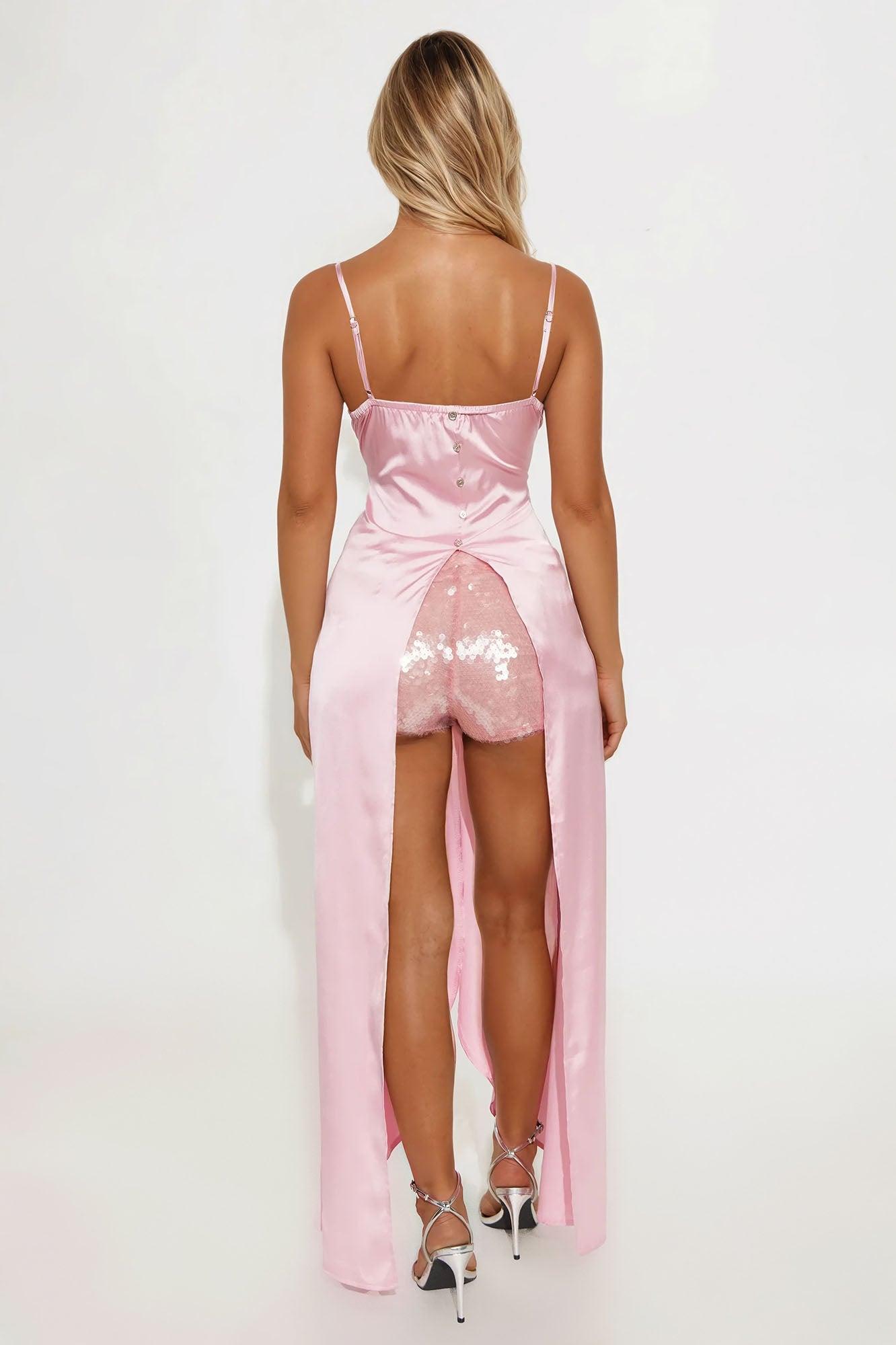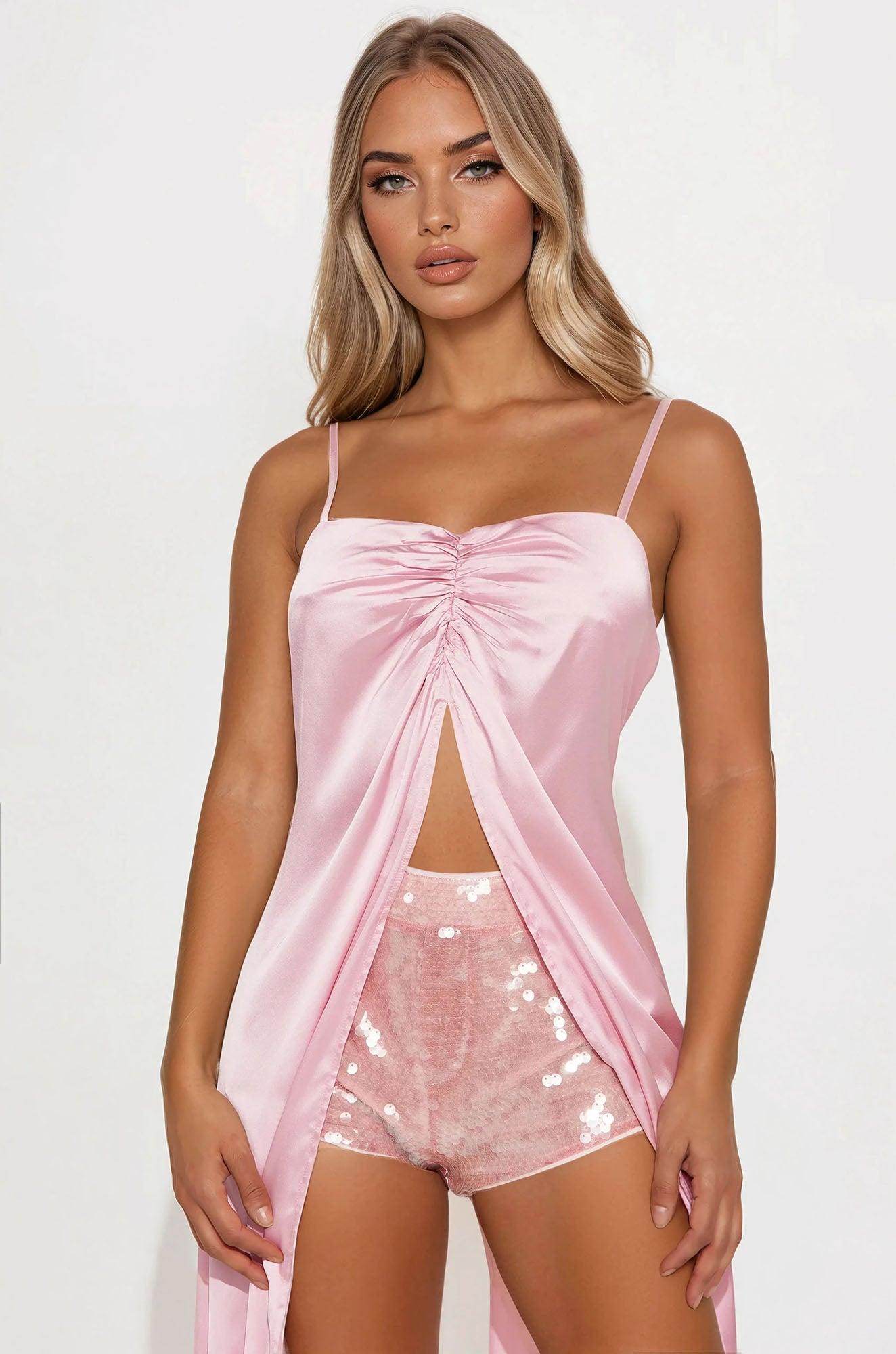Available In Ivory And Pink. Satin Ruched Top Non Stretch Faux Button Detail Adjustable Strasps 97% Polyester 3% Spandex Imported
