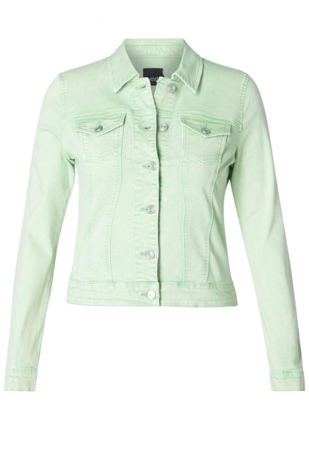 Timeless jeans jacket in trendy green pistachio green color. This jacket has a classic collar and closes with buttons. Due to the addition of elastane, this jacket is also nice and comfy! 55% Cotton, 33% Viscose, 10% Polyester, 2% Elastane