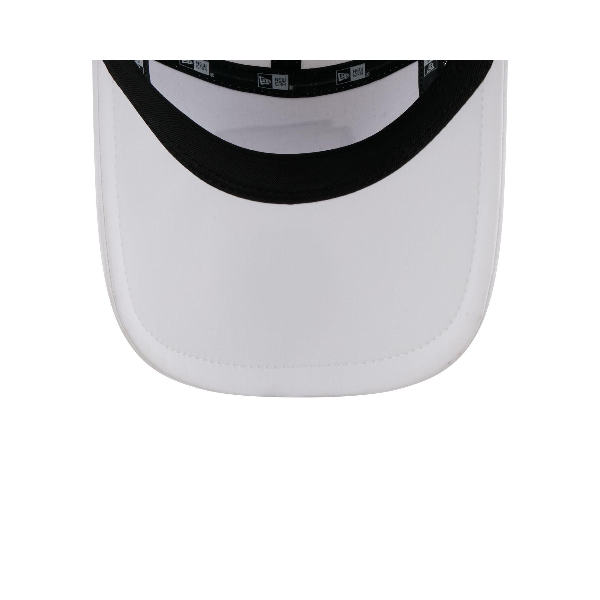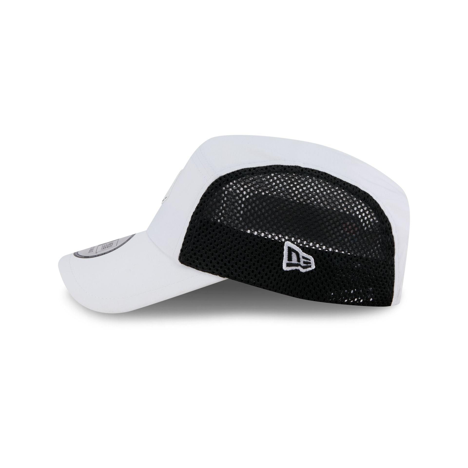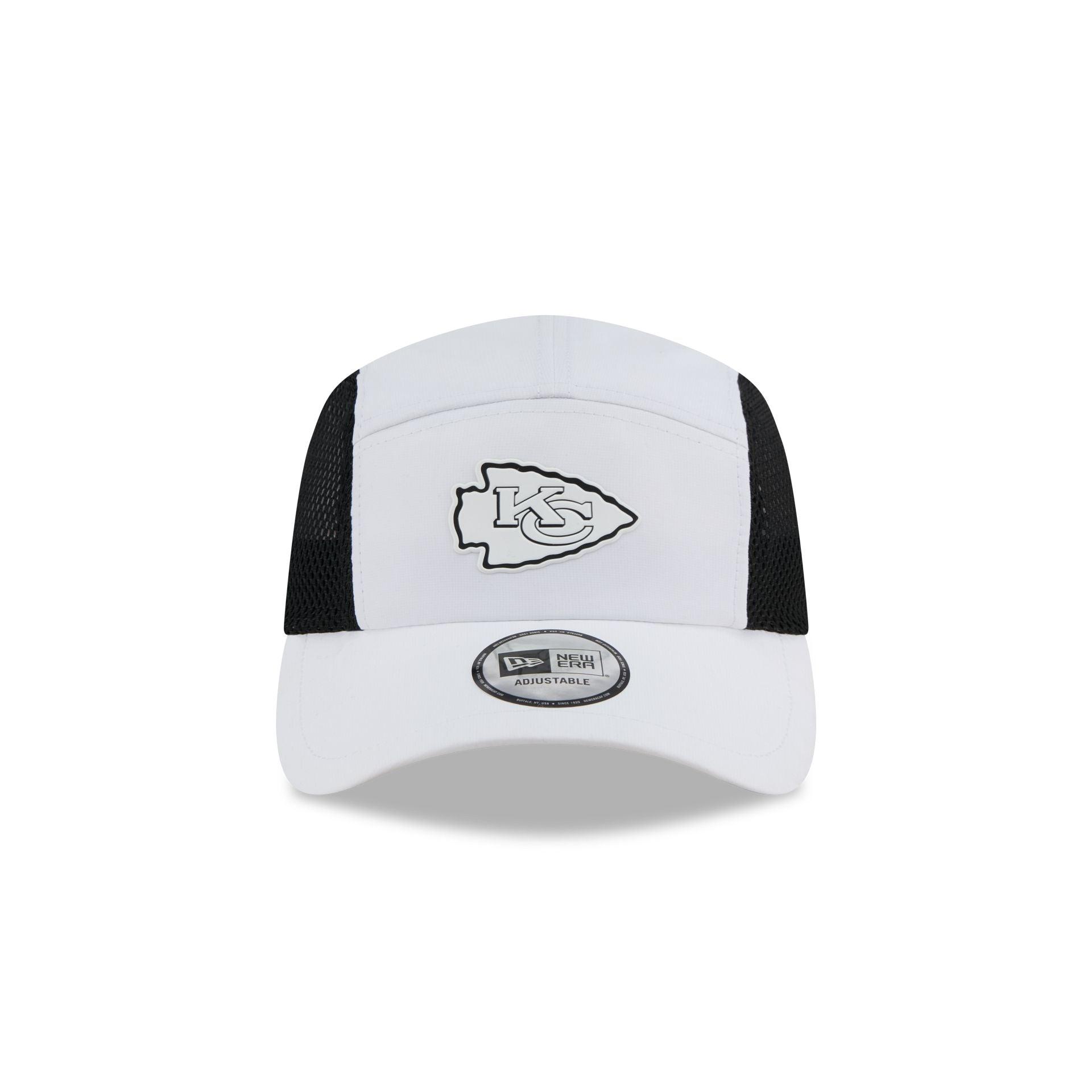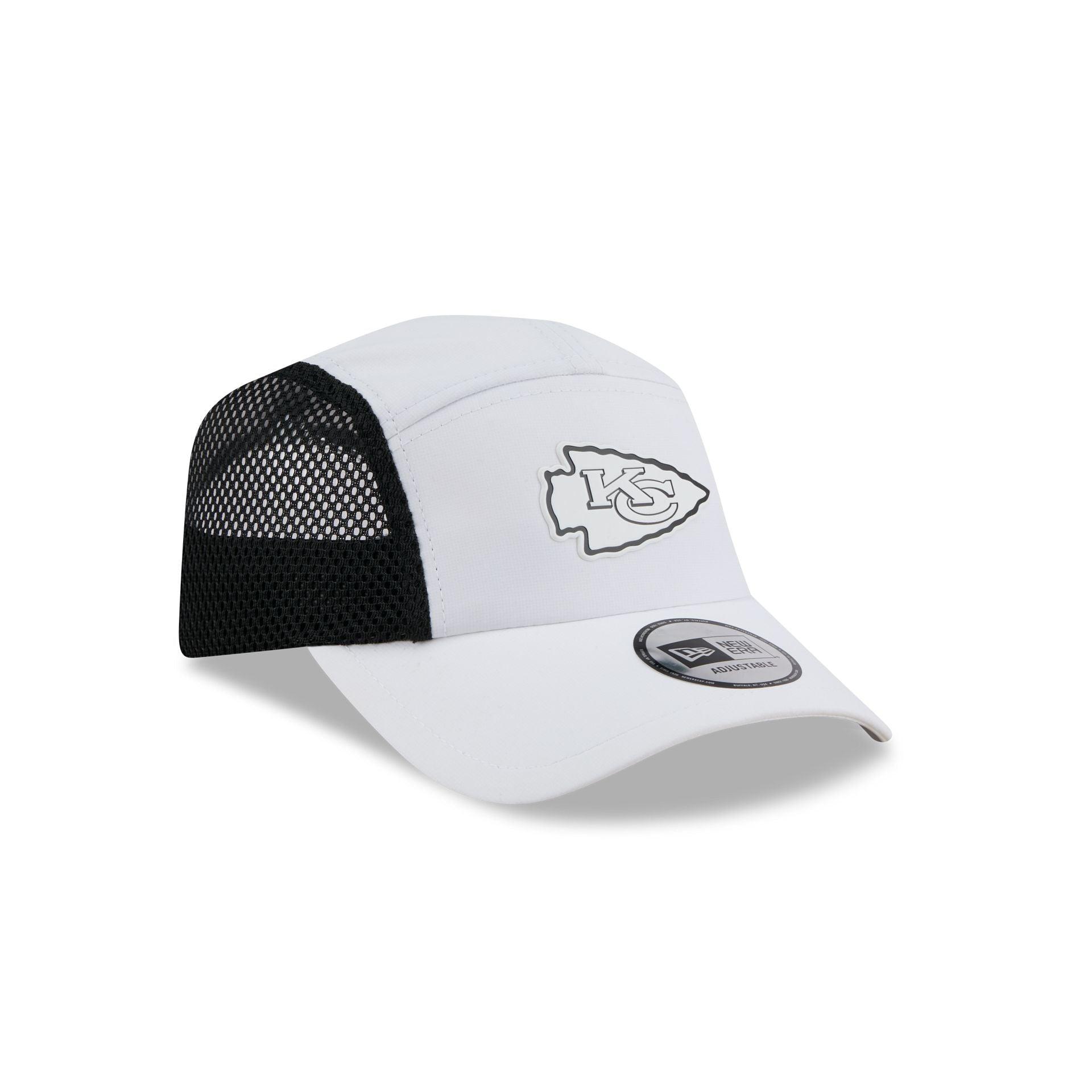 The Kansas City Chiefs White Poly Runner Cap features a heat sealed Chiefs logo at the front panels with mesh side panels. Additional details include a silicone patch above an adjustable drawstring closure at the rear.