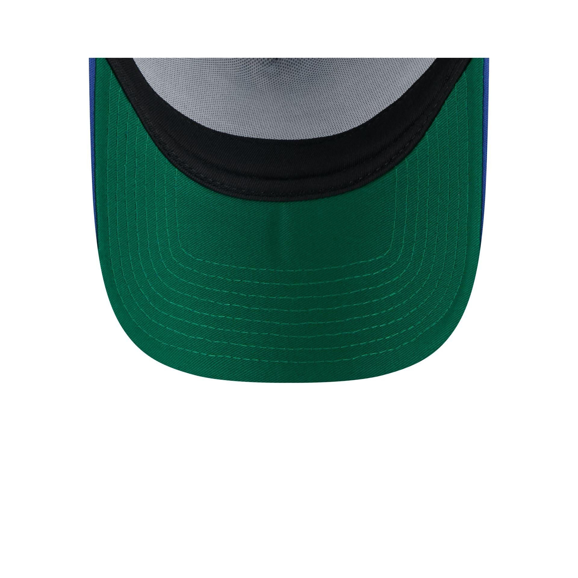 The Chicago Blackhawks Sport Classics 9FORTY A-Frame Trucker features a retro screen-printed Blackhawks wordmark at the front panels with a team logo at the left and right. Additional details include a mesh back, a gray undervisor, and a snapback closure at the rear.