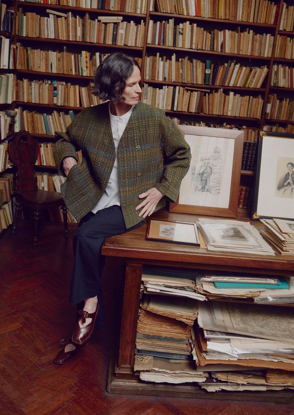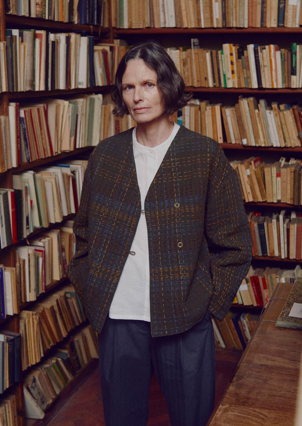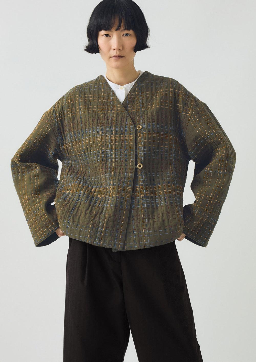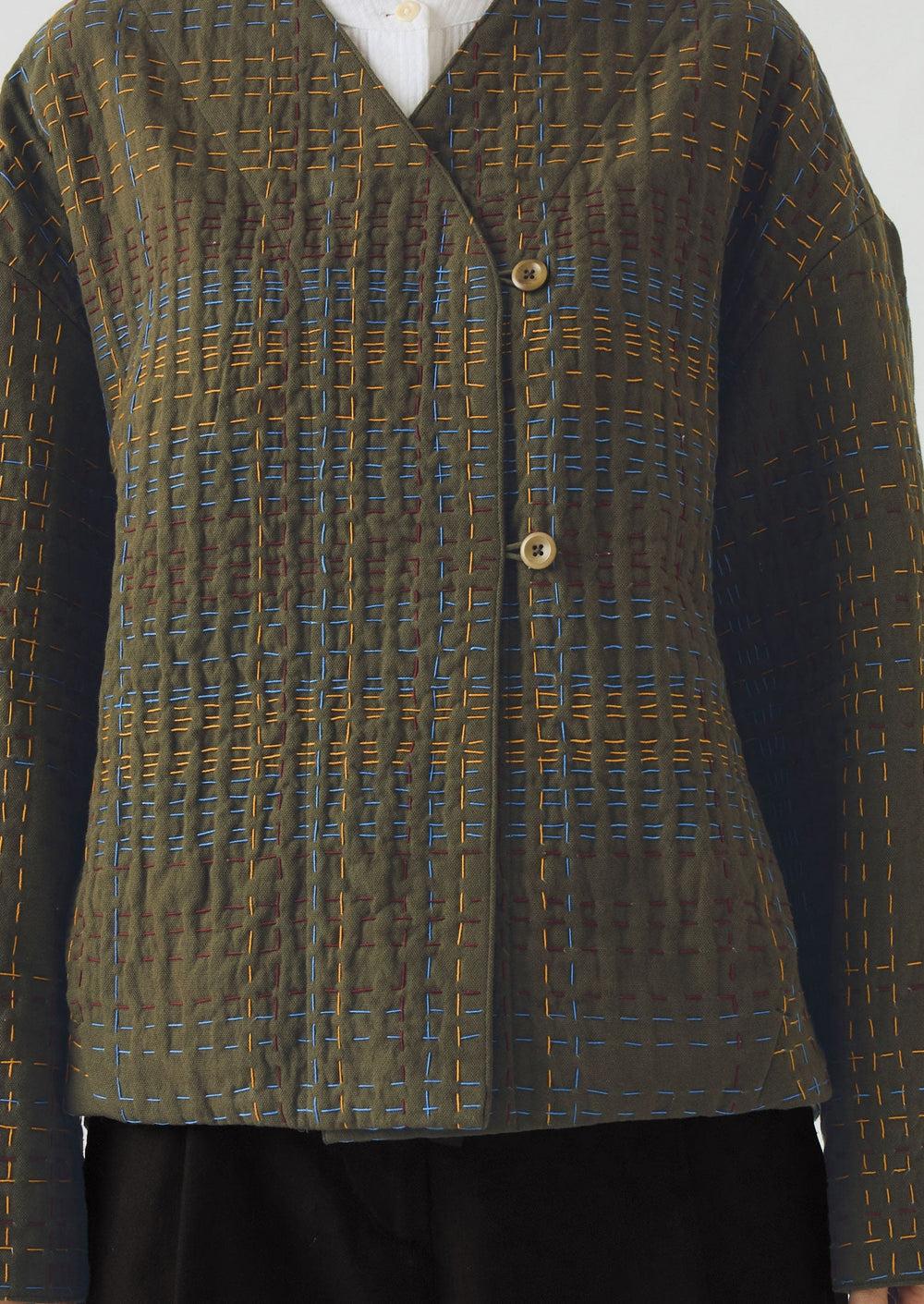 Organic cotton jacket. Lightly-padded. Cotton lining. Kantha. Easy shape. Button and loop fastening. V-neck. Corozo button. In-seam pockets.