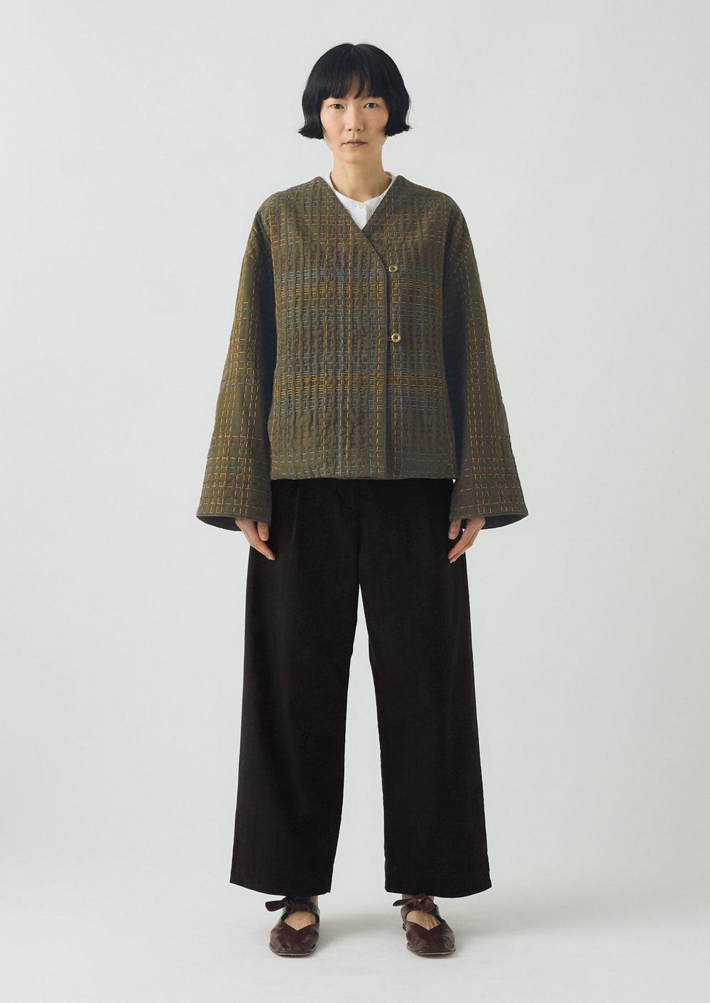 Our cotton jacket features intricate kantha stitching that reinterprets traditional tweed. With an organic cotton outer, this jacket is fully lined with cotton. The garment carries the unique character of kantha, hand-stitched by artisans in India. Cut to an easy V-neck shape with a button and loop fastening. With in-seam pockets.