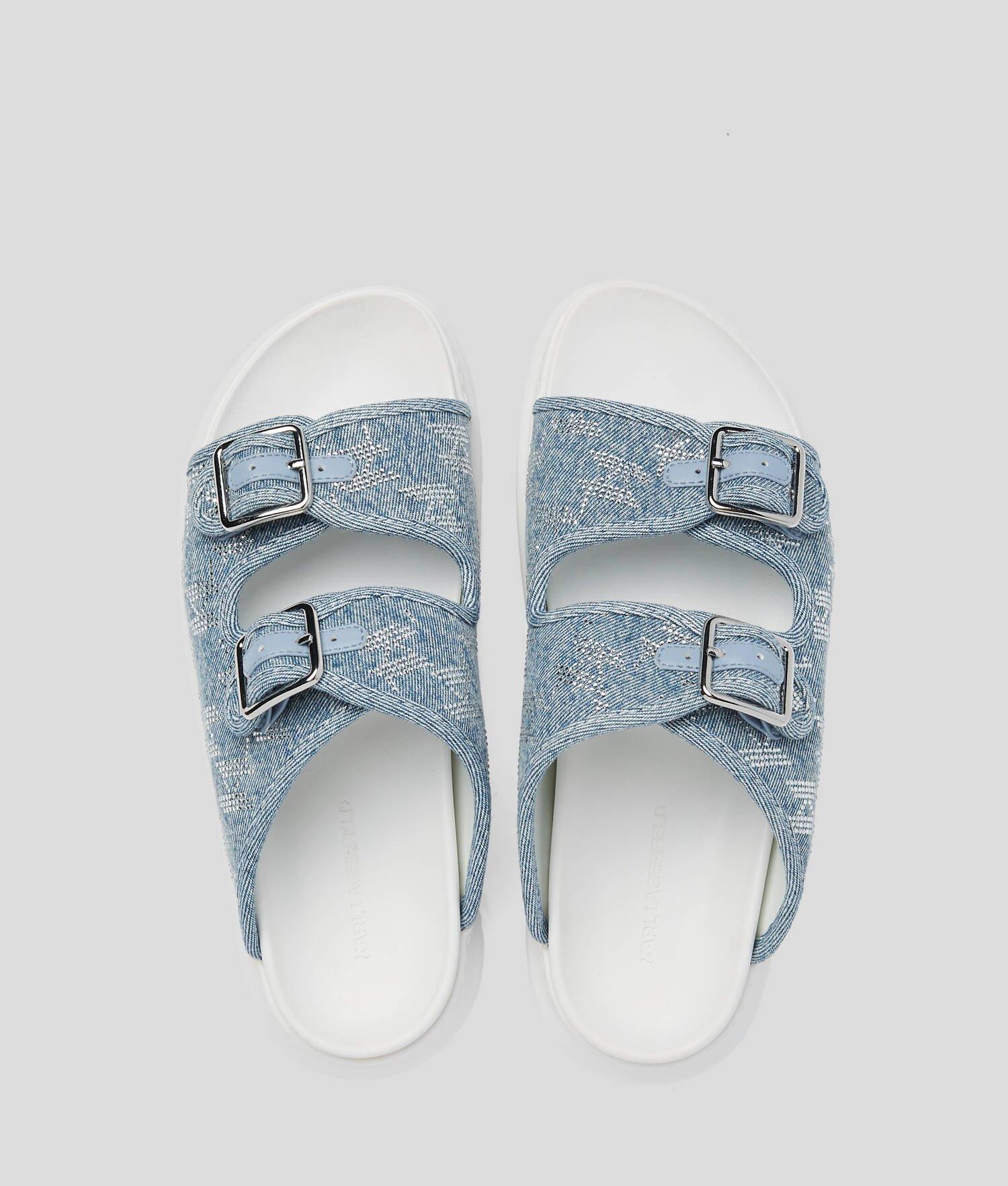 Embrace effortless style with these statement slippers, featuring twin adjustable straps for a personalized fit. A molded footbed ensures comfort, while the washed denim design adorned with sparkling rhinestones and the KARL Monogram adds a touch of glamour.