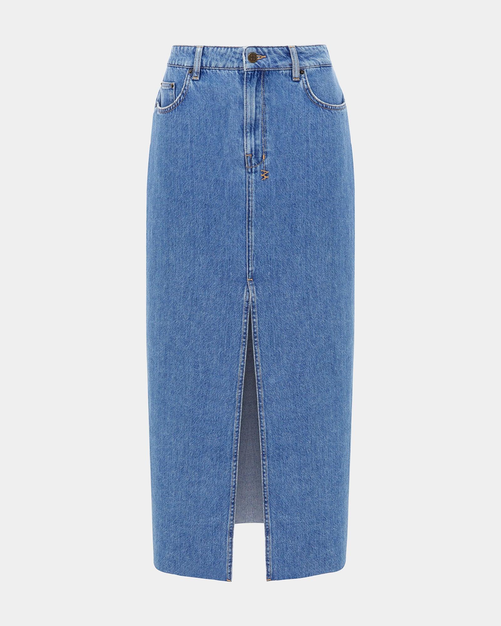The Kara Maxi Skirt Heritage is a low-rise maxi skirt with classic five-pocket styling and a raw-cut hem. Crafted from premium European lightweight denim in a mid-blue Heritage shade. This skirt features a high center front split, light grinding, and Ksubi branding. It's designed to sit lower on the hips and is cut straight for a flattering silhouette. Additionally, it comes with a removable Ksubi pocket tag on the back right pocket.