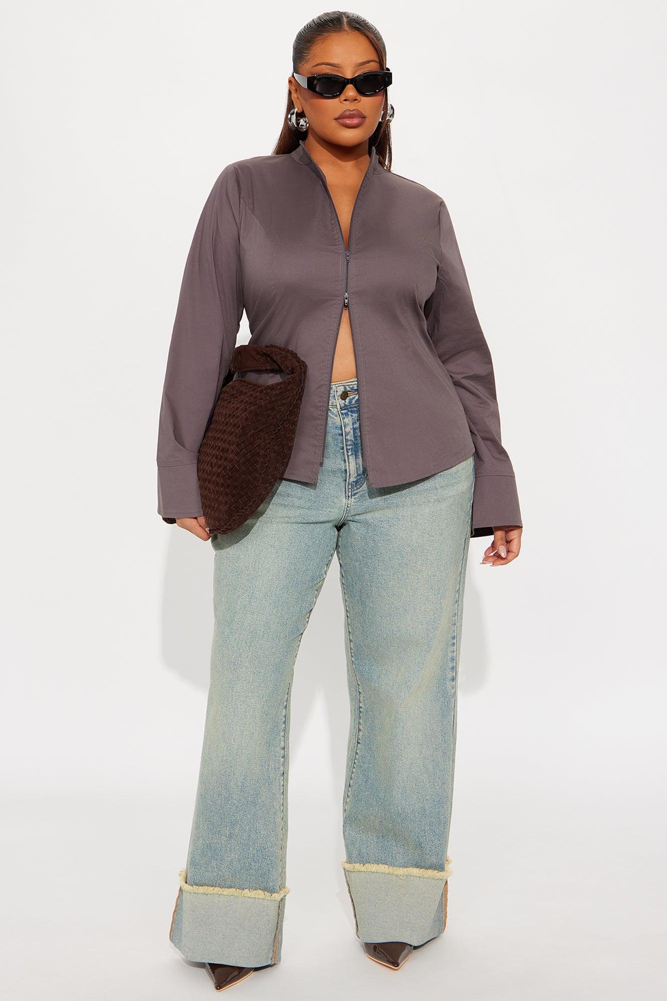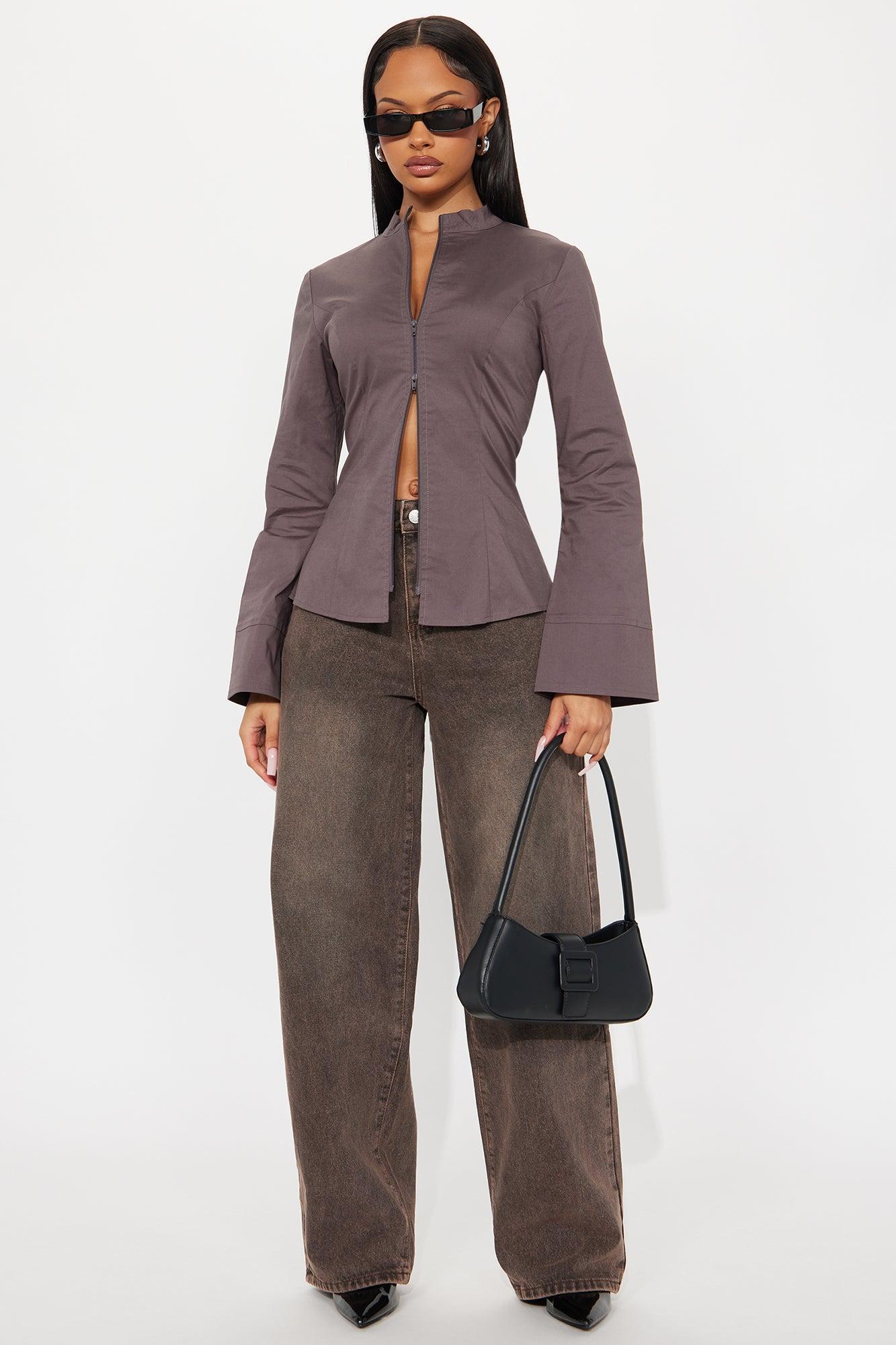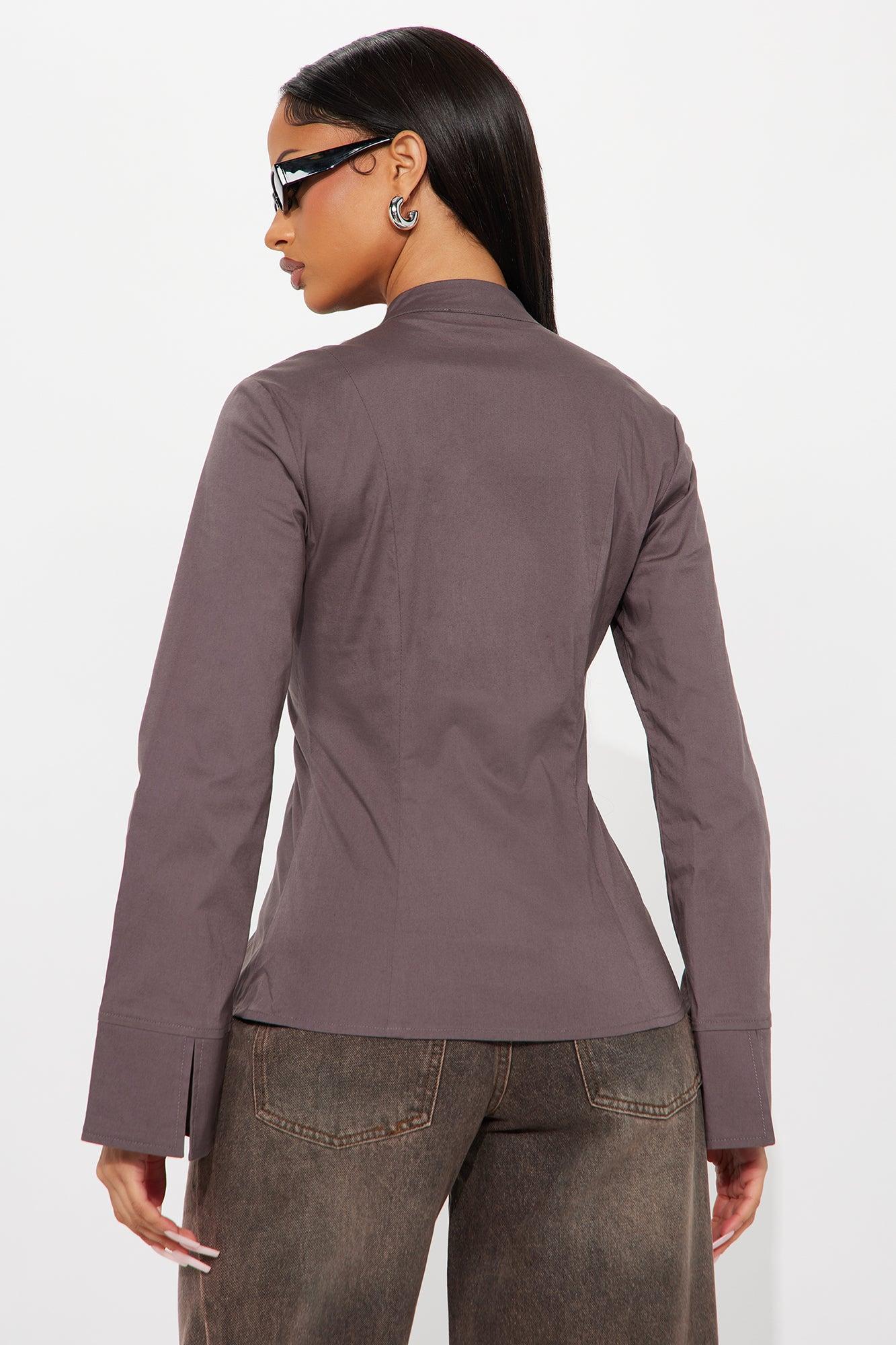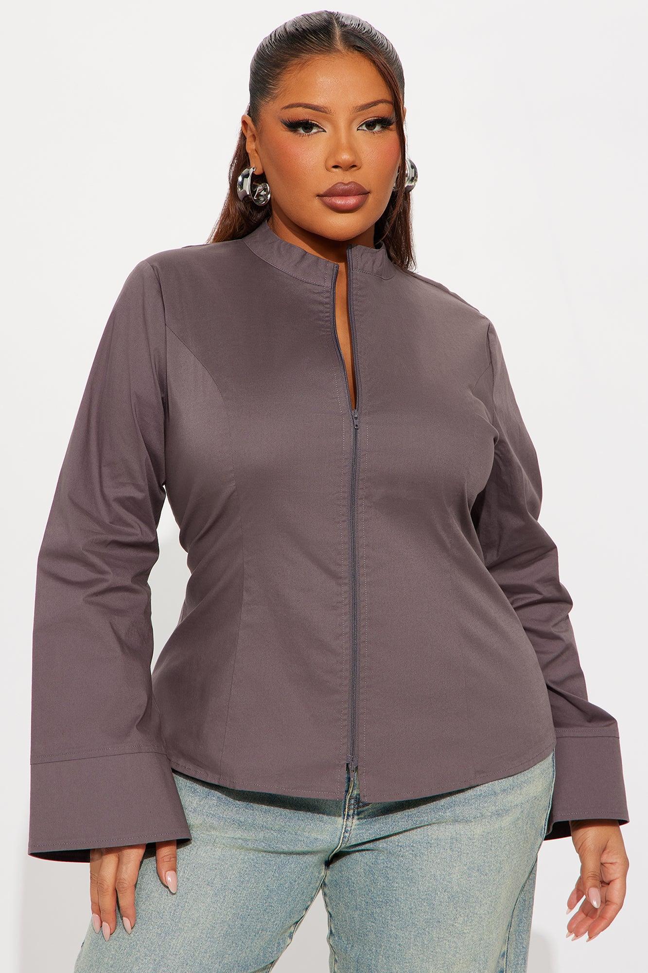 Available In Black, Burgundy, Chocolate, Grey And White. Striped Poplin Top Long Sleeve Collar Front Zipper Closure Non Stretch Self: 97% Cotton 3% Spandex Imported California Proposition 65WARNING: Cancer and Reproductive Harm - www.P65Warnings.ca.gov.