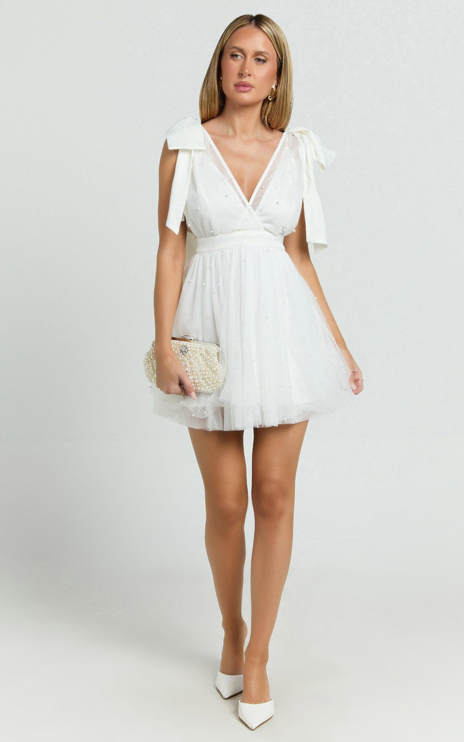 Get ready to turn heads in our Karalyn Mini Dress! This stunning white dress is the perfect choice for your next special occasion, whether it's a spring wedding or a party night with friends. The bow strap and pearl details add a touch of femininity, while the plunging neckline brings an element of allure. Made from soft and comfortable acrylic fabric, this fit & flare dress will make you feel confident and empowered all day or night long. Whether you're dancing on the dance floor or enjoying cocktails with friends, this sleeveless mini dress is sure to be a showstopper. So why wait? Add some elegance to your wardrobe with our Karalyn Mini Dress today!Product Details:Fit & Flare Dress, Wedding GownPlunge necklineMini lengthSleeveless styleSuitable for weddings, party day, and party night eventsMade of acrylic materialPerfect for spring seasonSize and FitSize S / 8 length: 84.5cm / 33.27inStudio model is wearing size XS / 6 AU / 2 US / 6 UK / 34 EUStudio model measurements are:Height: 170cm / 5'7''Bust: 84cm / 33''Waist: 61cm / 24''Hip: 88cm / 35''Studio model is wearing size XXXL / 18 AU / 14 US / 18 UK / 46 EUStudio model measurements are:Height: 172cm / 5'8''Bust: 111cm / 44''Waist: 91cm / 36''Hip: 129cm / 51''Material and CareAcrylicLow / No stretch