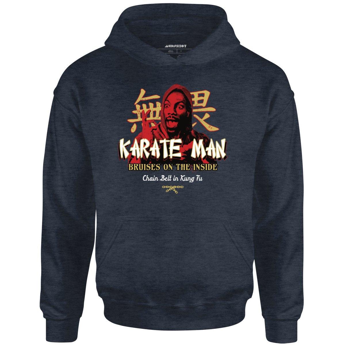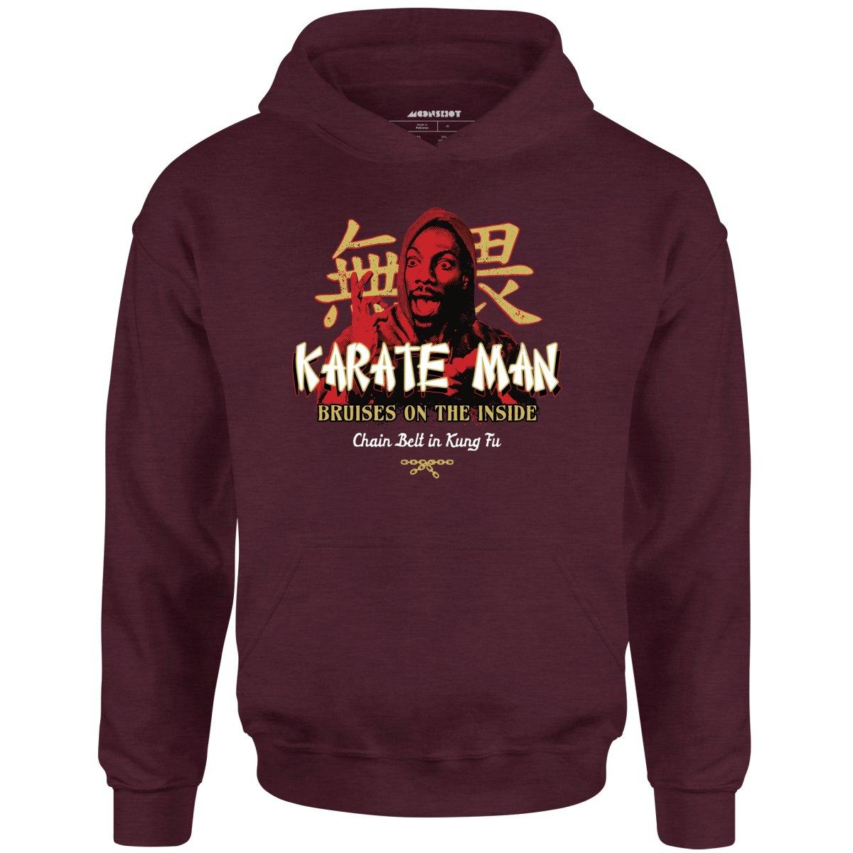Karate Man bruises on the inside. He's got a chain belt in kung fu. Inspired by Billy Ray Valentine from Trading Places. Printed on our warm & cozy heavyweight unisex hoodie (hooded sweatshirt). We print & ship all of our high quality graphic hoodies in the USA.