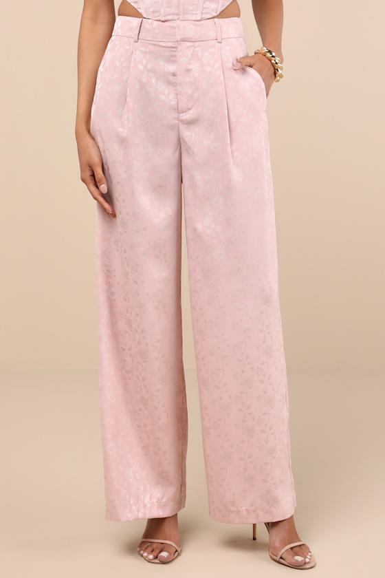 Something as chic as these sleek satin pants are easy to wear and even easier to compliment. A sweet floral design accents the wide-leg silhouette, featuring a high, banded waist, belt loops, pleated details, and a hidden clasp closure atop a zip fly. Diagonal front pockets complete the look. Pair with the matching top for a complete look!
