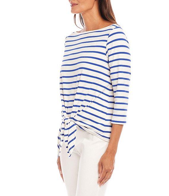 From Karen Kane, this top featuresStretch knit fabricationBoat neckline3/4 sleevesStriped printTie front detailPullover constructionApprox. 22.25" lengthRayon/elastaneMachine wash cold/flat dry or dry cleanImported.