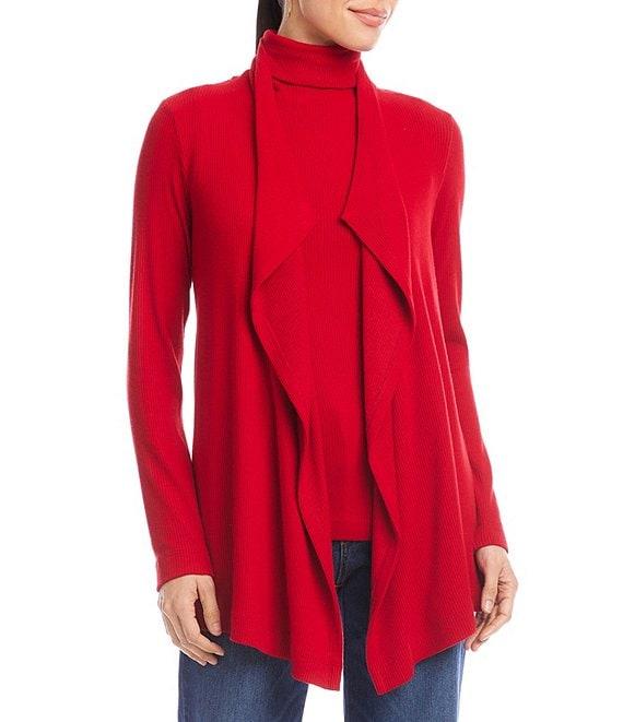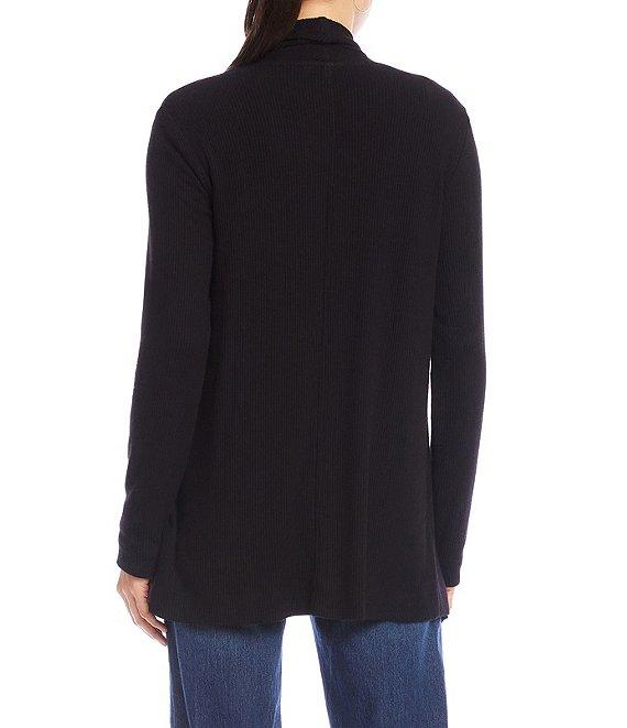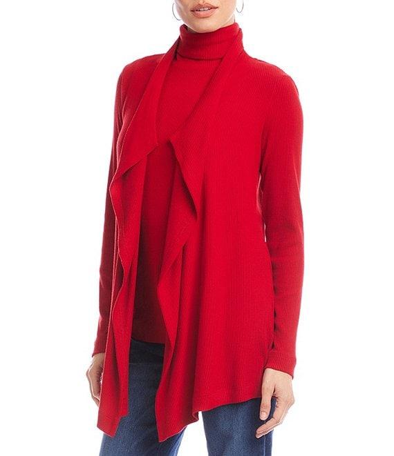 From Karen Kane, this cardigan features: Brushed ribbed fabrication Open front neckline Drape front Long sleeves Relaxed fit No pockets High-low hem shorter in the back and longer in the front Open front: no closure Approx. 28. 875" center front length; 26.25" center back length Viscose/spandex; contrast: rayon/spandex Hand wash Made in the USA.
