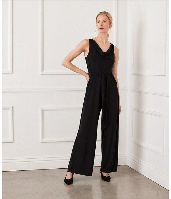 From Karen Kane, this jumpsuit features: Travel jersey fabrication V-neckline Sleeveless Side seam pockets Self tie wait Lined Back zip closure Approx. 55.75" length Polyester/spandex Hand wash cold/dry flat Imported.