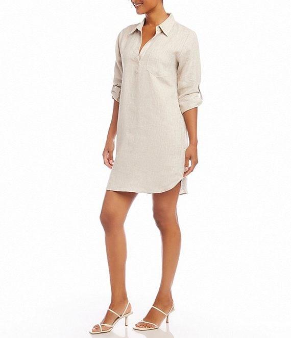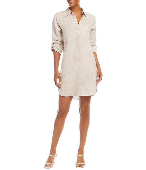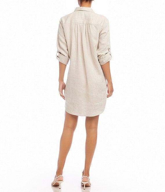 From Karen Kane, this shirtdress features: Linen fabrication Shirtdress silhouette Collared V-neckline 3/4 roll-tab sleeves with buttoned closure Unlined Front patch pocket Shirttail hem Pullover construction Approx. 36 5/8" length Linen Dry clean only Made in the USA.