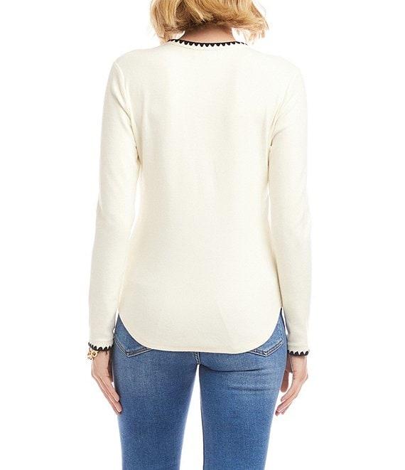 From Karen Kane, this top features: Knit fabrication Crew neckline Long sleeves Contrast edge stitch detail along the neckline and cuffs Shirttail hemline Pullover construction Approx. 25.25" length Cotton/spandex Machine wash cold/hang to dry Imported.