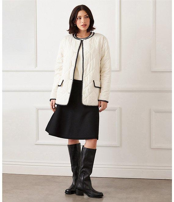 From Karen Kane, this jacket features: Quilted woven fabrication Crew neckline Long sleeves Contrast edge stitching Two front functional flap pockets Straight hemline Lined Button front closure Approx. 28.25" length Polyester; lining: polyester Machine wash cold/ hang to dry Imported.