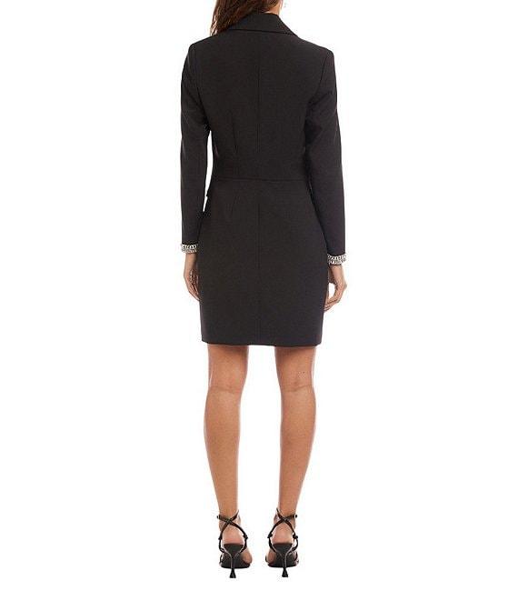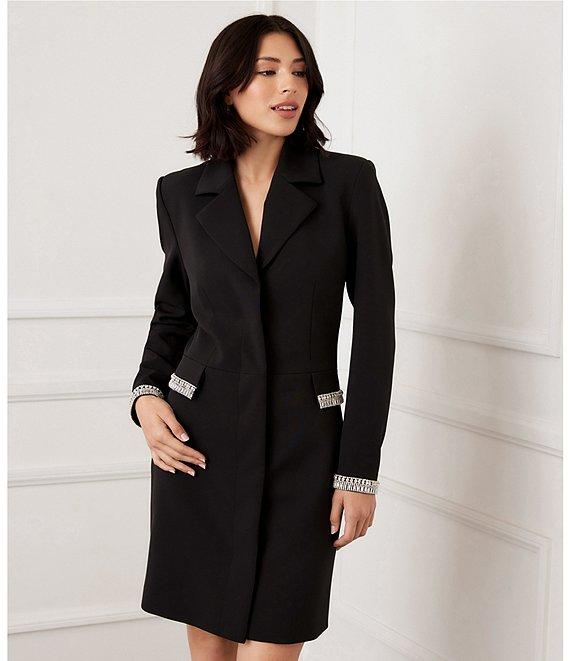 From Karen Kane, this dress features: Crepe fabrication Embellished gems at cuffs and pockets Blazer silhouette Notch collar neckline Long set-in sleeves Embellished front flap pockets Fully lined Inner hidden front button placket closure Approx. 37" length Polyester/spandex Hand wash cold/dry flat Imported.