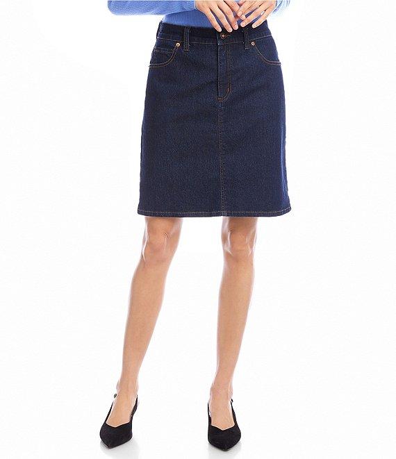 From Karen Kane, this skirt features: Denim fabrication Straight silhouette Belt loops 5 pocket style Above knee length Front button and zipper closure Approx. 21.5" length Cotton/ polyester/ spandex Machine wash cold/tumble dry low Made in the USA of imported fabric.