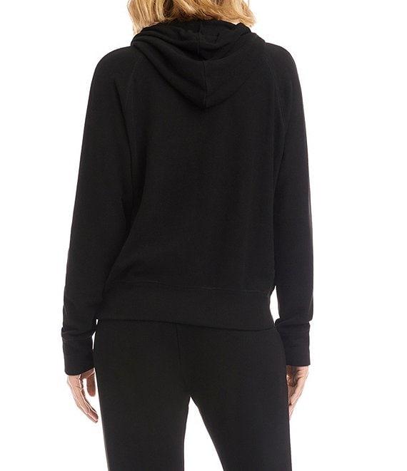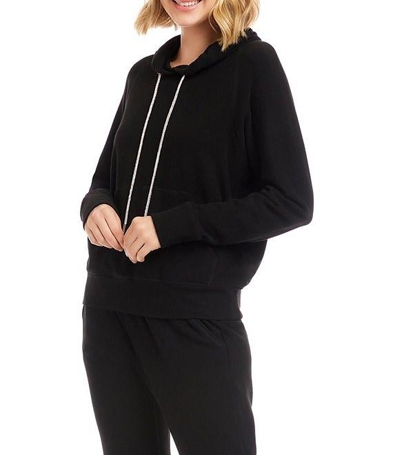 From Karen Kane, this sweatshirt features: Double knit fabrication Hooded Rhinestone-embellished drawstrings Long raglan sleeves Kangaroo pocket Ribbed hem and cuffs Pullover construction Approx. 22.25" length Raon/ polyester/ elastane Machine wash cold/ tumble dry Imported.