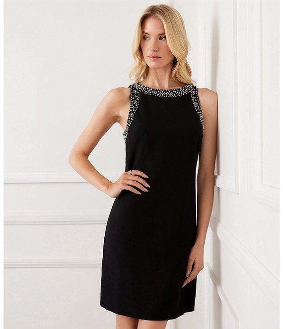 From Karen Kane, this dress features: Crepe fabrication Shift silhouette Boat neck Sleeveless Bead embellishments around neckline and armholes Side bust darts Lined Concealed back zip with hook eye closure Approx. 36.25" length Polyester/spandex; Lining: polyester Hand wash cold/ dry flat Imported.