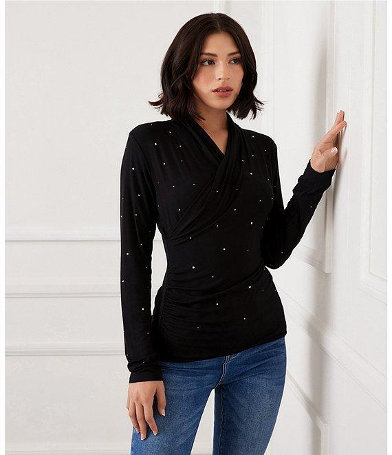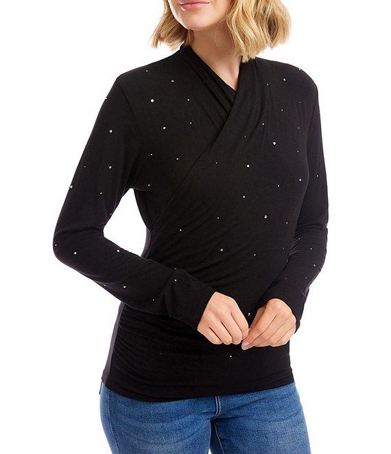 Karen Kane Embellished Jersey Long Sleeve Drape Front Crossover Top