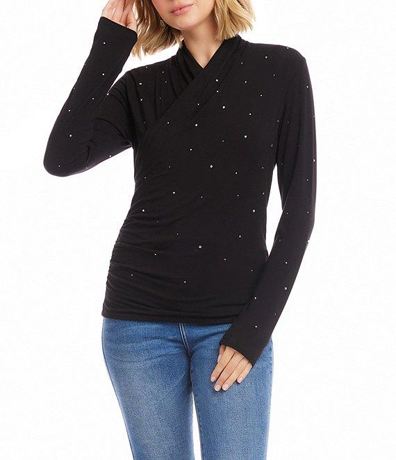 From Karen Kane, this top features: Jersey fabrication Embellished Draped crossover v-neckline Long sleeves Side shirring Straight hemline Pullover construction Approx. 23.5" length Rayon/spandex Hand wash cold Imported.