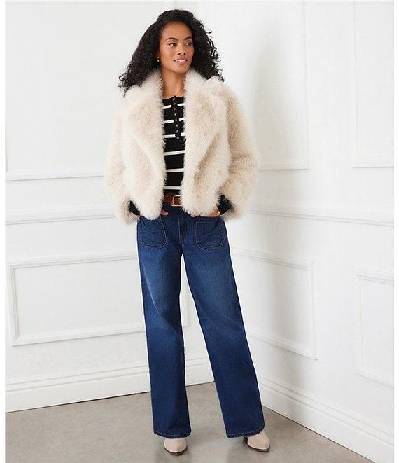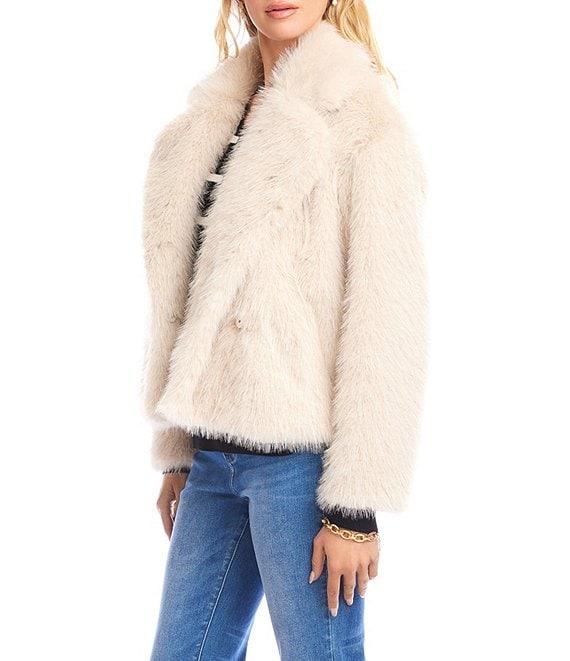 From Karen Kane, this jacket features: Faux fur fabrication Cropped length Wide notched collar Long sleeves Lined 2 side seam functional pockets Straight hemline Front button closure Approx. 22" length Polyester Wipe clean damp cloth/ or dry clean Imported.
