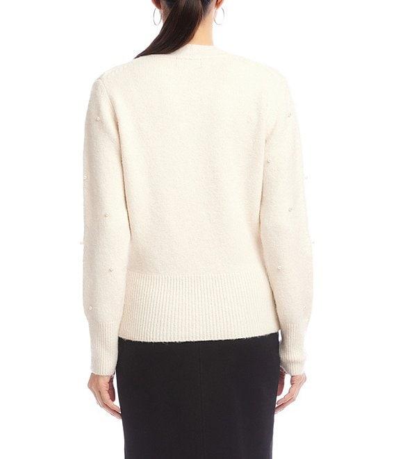 From Karen Kane, this sweater features: Wool blend fabrication Faux wrap silhouette V-neckline Long sleeves Faux pearl embellishments Ribbed hemline Pull over construction Approx. 23" length Polyester/acrylic/nylon/ wool/spandex Hand wash cold/ dry flat Imported. Elegant and feminine, this long-sleeve sweater features a faux-wrap design with a deep V-neckline and pearl embellishments throughout. Crafted with minimal wool for a soft, lightweight feel and finished with a ribbed hem. Pull-on style for easy wear.