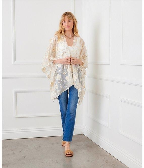 From Karen Kane, this cardigan features: Floral chiffon fabrication Open front 3/4 flared sleeves Embroidery detail Slip-on construction Open front/no closure Approx. 32.625" length Viscose; trim: cotton/metallised fiber Dry clean only Imported.