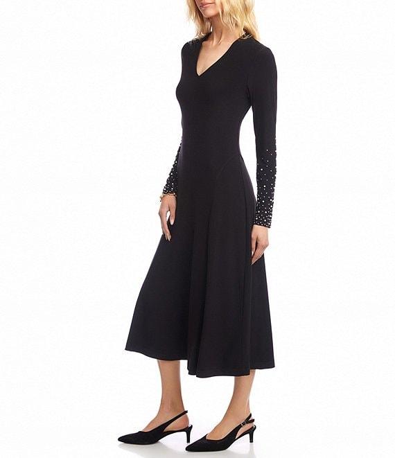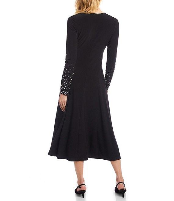 Karen Kane Kate Travel Jersey V-Neck Embellished Long Sleeve A-Line Midi Dress