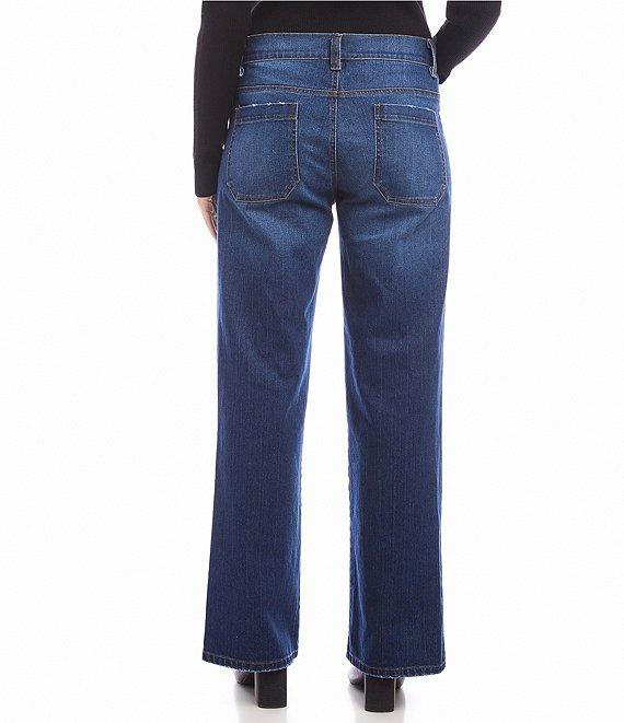 From Karen Kane, these pants feature: Denim fabrication Wide leg silhouette High rise Patch front and back pockets Belt loops Front button/zipper closure Approx. 32.5" inseam; 10.625" rise Cotton/elastane Machine wash/tumble dry Made in the USA of imported fabric.