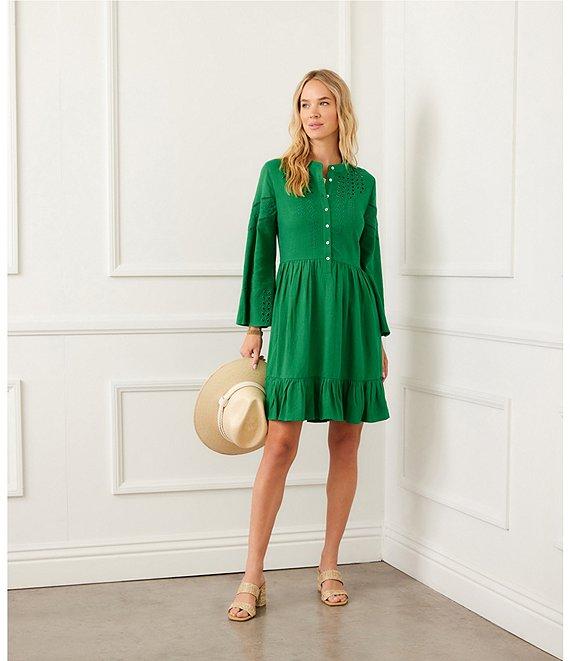 From Karen Kane, this dress features: Embroidered details Round neckline Long flare sleeves Tiered skirt Front partial button closure Approx. 36.25" length Linen/viscose Machine was cold/ tumble dry low or dry clean Imported.