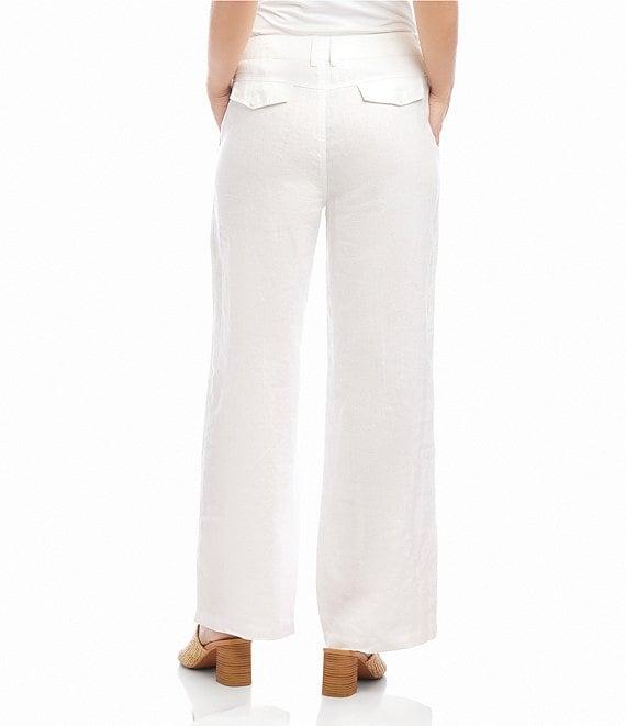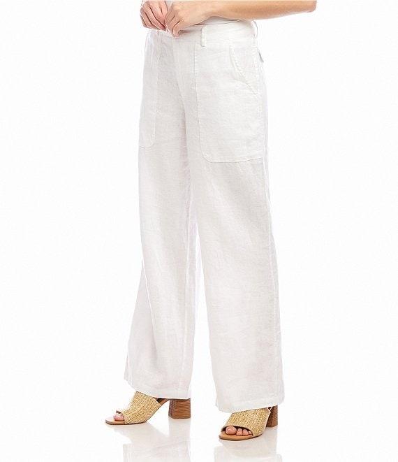 From Karen Kane, these pants feature: Lightweight linen fabrication Wide leg Mid rise Belt loops 2 functional front and 2 faux back pockets Front button and zipper closure Approx. 31" inseam, 11" rise Linen Machine wash cold/line dry or dry clean Imported.