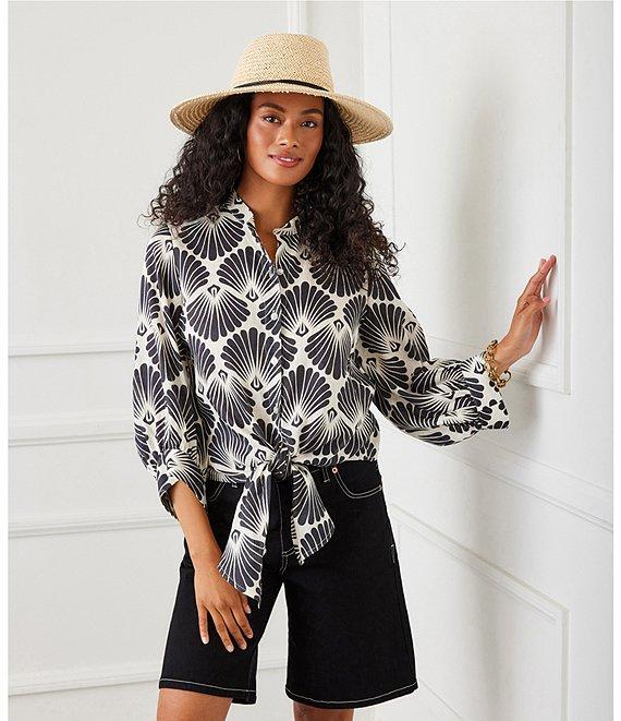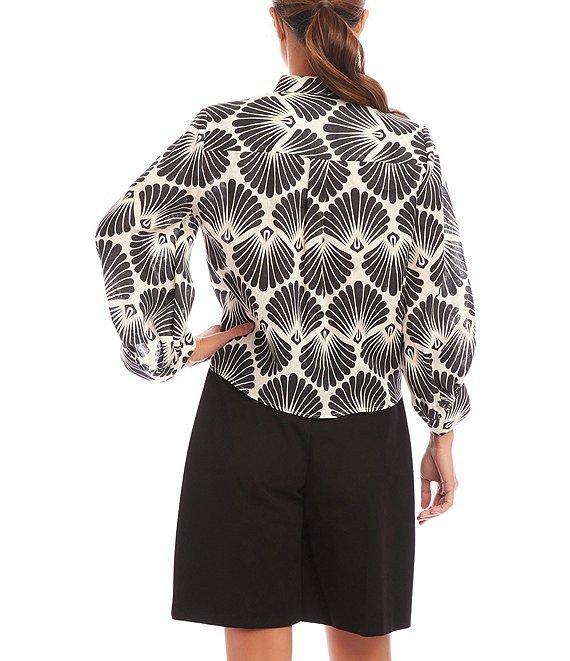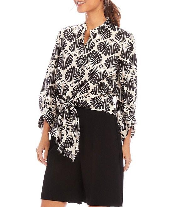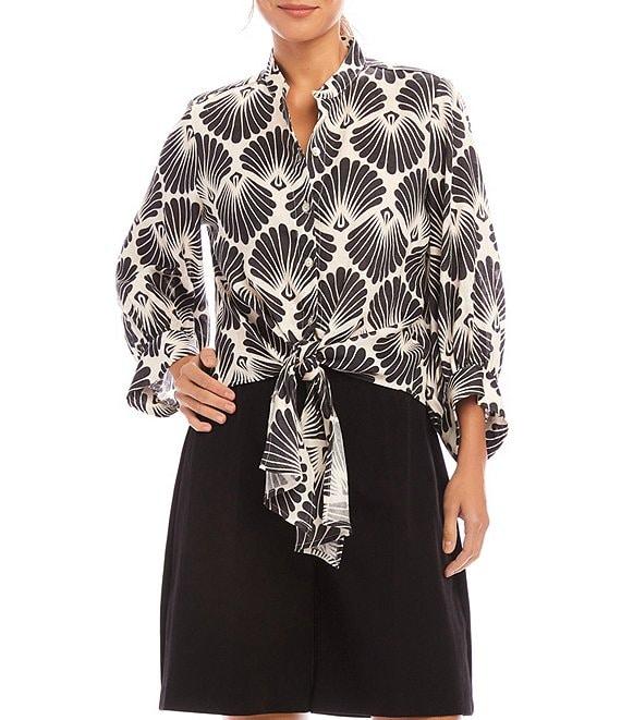 From Karen Kane, this top features: See shell print Mandarin collar 3/4 blouson sleeves Button front closure Tie-front Linen Dry clean only Made in the USA.