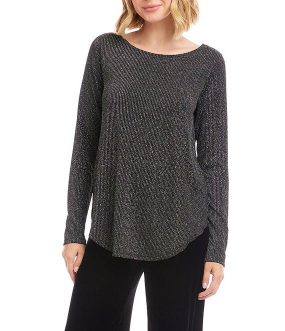 Karen Kane Metallic Stripe Knit Scoop Neck Long Sleeve Shirttail Top
