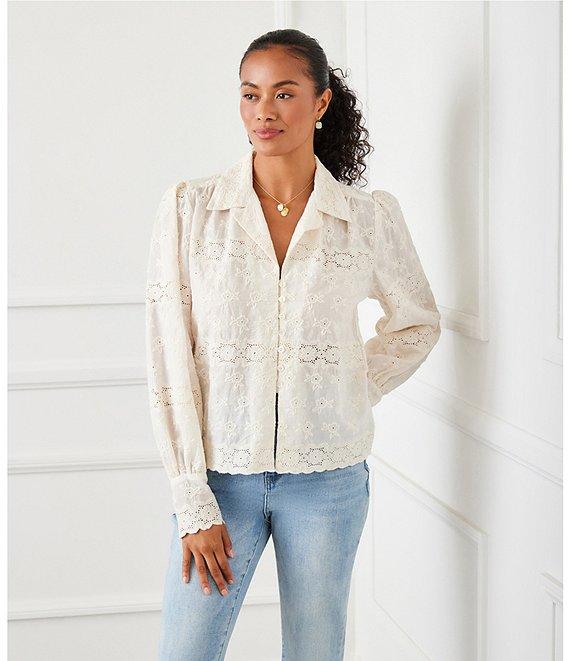 From Karen Kane, this blouse features: Embroidered floral design and eyelet detail Notch collar Long sleeves Front button closure Scalloped hem and cuffs cotton Dry clean only Imported.