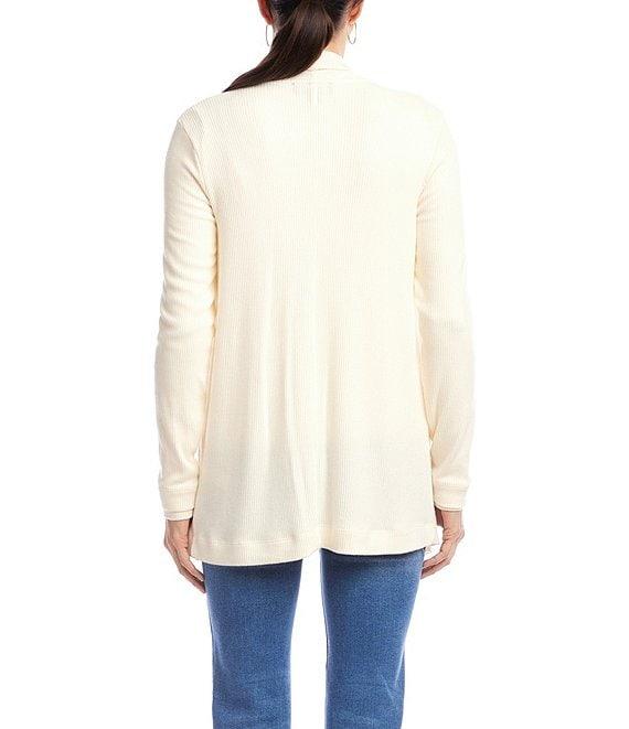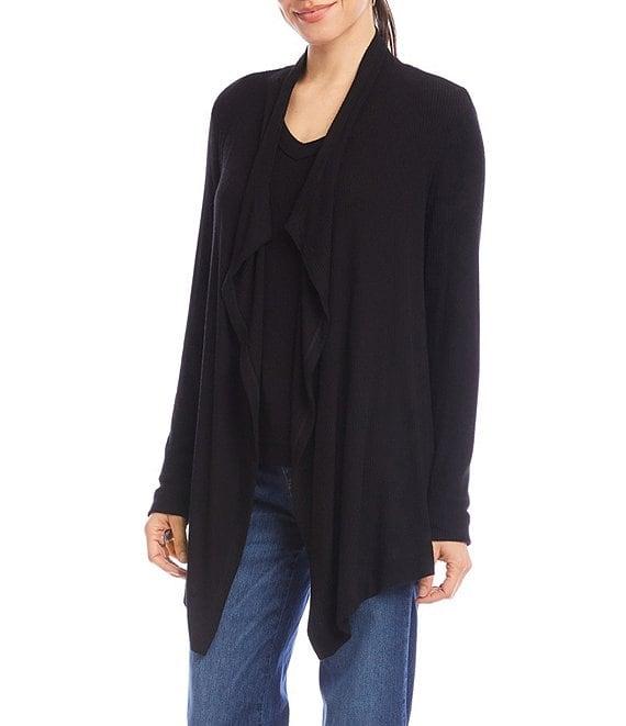 From Karen Kane Petite, this cardigan features: Brushed ribbed fabrication Open front neckline Drape front Long sleeves Relaxed fit No pockets High-low hem shorter in the back and longer in the front Open front: no closure Approx. 26.25" length Viscose/spandex; contrast: rayon/spandex Hand wash Made in the USA.