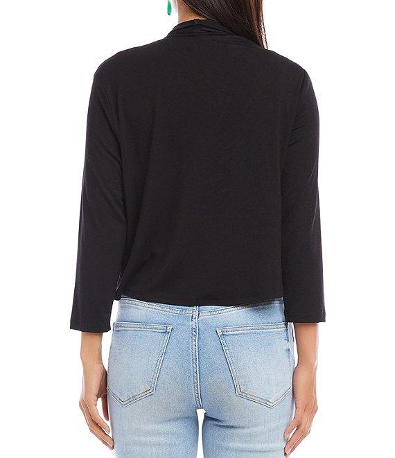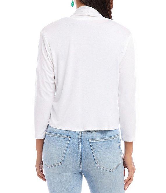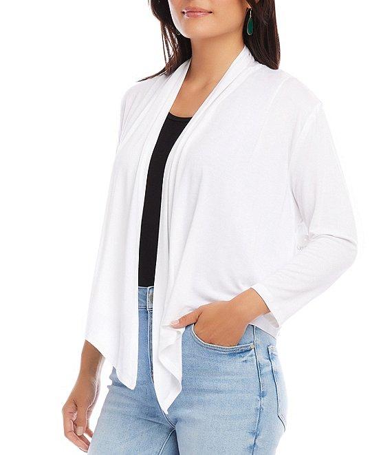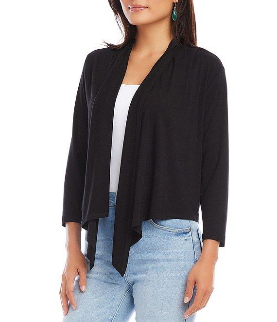 From Karen Kane Petite, this cardigan features: Knit fabrication Drape front Shawl collar Bracelet length sleeves Open front: no closure Approx. 27.375" length Rayon/spandex Dry clean or hand wash Made in the USA. Elevate your style with this versatile cardigan that is perfect for throwing over a dress for a night out or pairing with your favorite jeans for a casual day. The relaxed silhouette drapes effortlessly, creating a flattering and comfortable fit.