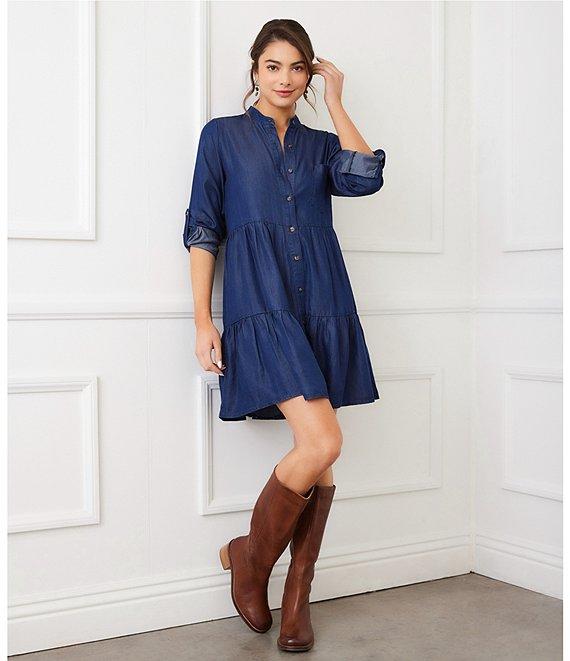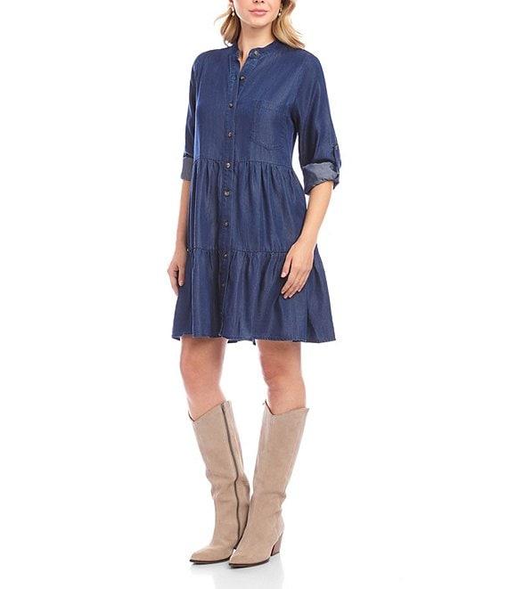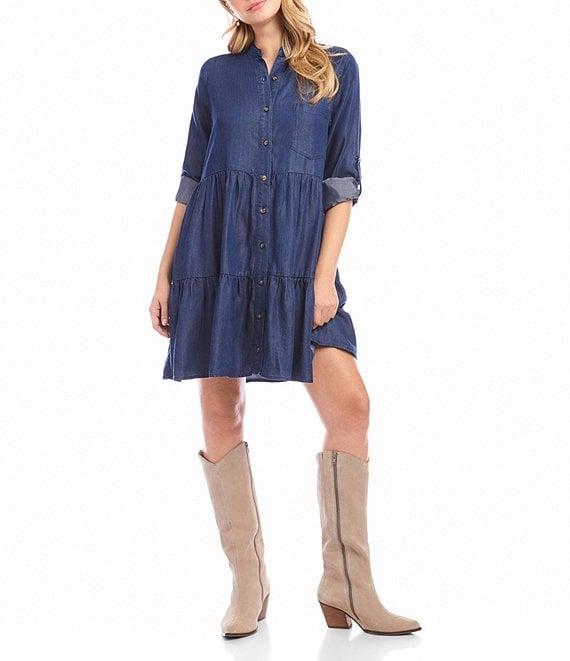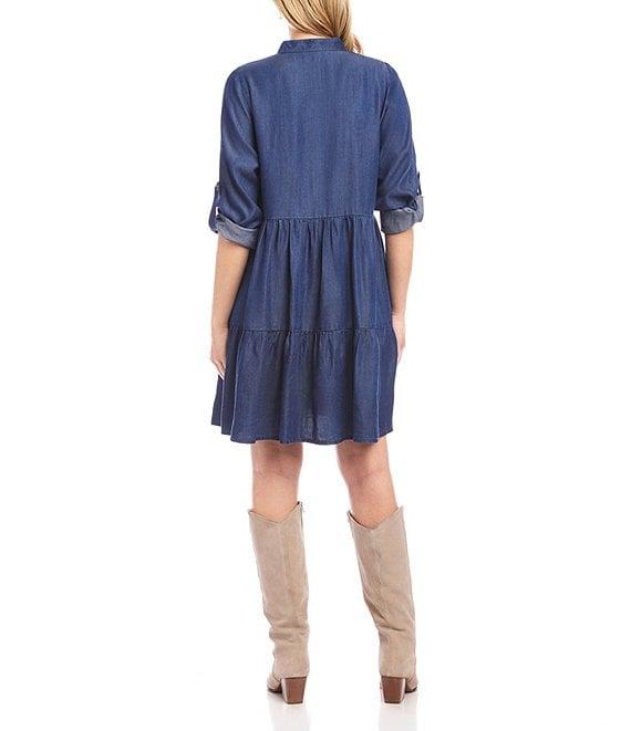 From Karen Kane Petite, this dress features: Chambray fabrication Shirt dress silhouette Crew neckline Long roll-tab sleeves Chest pocket Two side seam functional pockets Tiered skirt Front button closure Approx. 35.75" length Lyocell Hand wash/flat dry Imported.