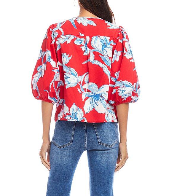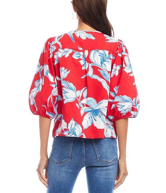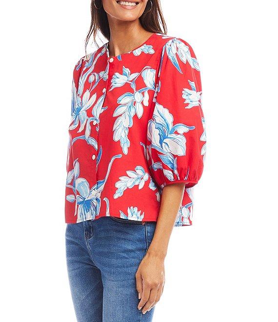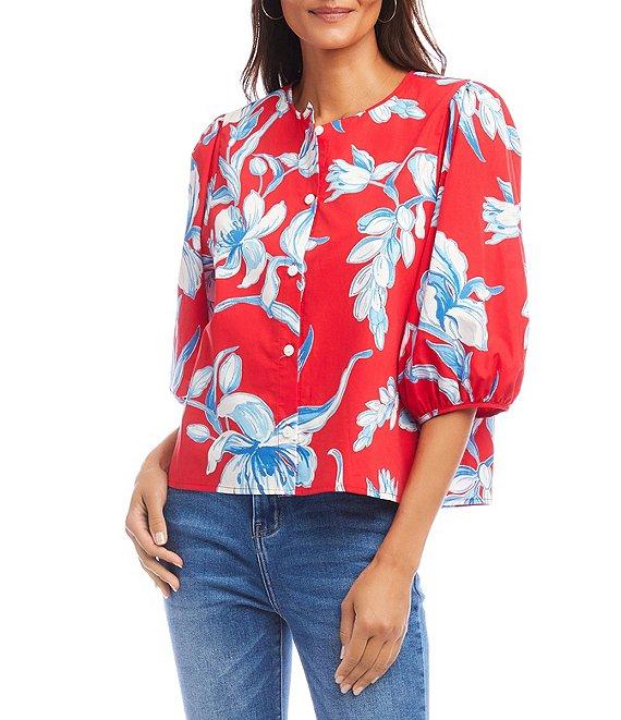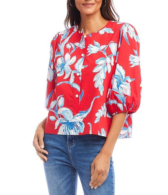 Karen Kane Petite Size Cotton Floral Round Neck 3/4 Puff Sleeve Button Front Shirt